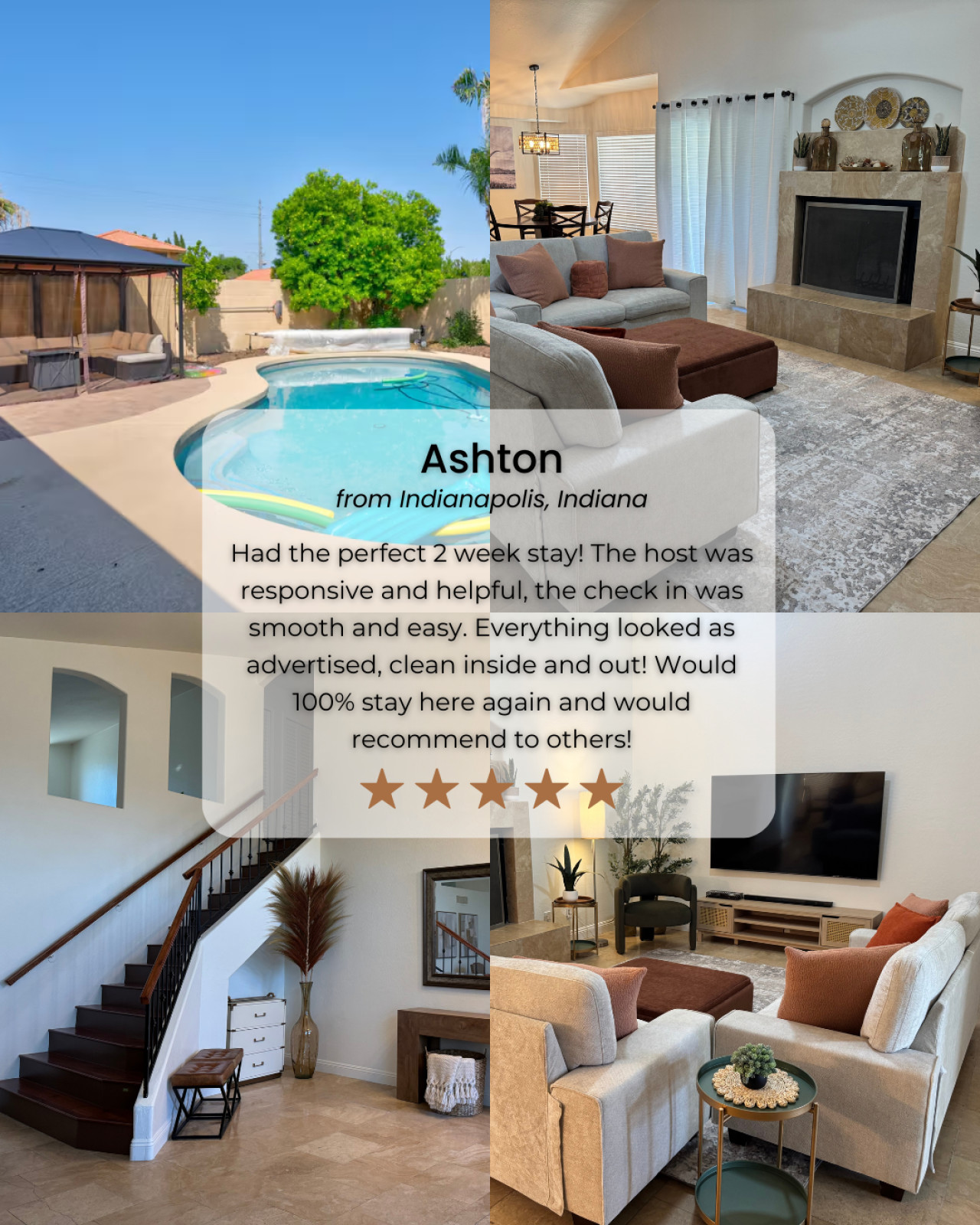 All about this stylish home in the heart of Scottsdale! - 4 BR / 2.5 bath home in North Scottsdale - Heated pool & Above ground Hot Tub (for a fee) - Outdoor Gazebo w/ netting - Outdoor TV and Games This is an entire home for your and your guests.... We can service our guest the quickest via the Airbnb app. ************************************** NOTICE TO POTENTIAL GUEST/S ************************************** - To comply with City and State regulations & to maintain the integrity of the neighborhood we do NOT allow any large gatherings or Parties. (Any unauthorized/unregistered vehicles or guests equates to immediate eviction with no refund & complete banning from booking channel. - We are committed to abiding by all state, county and city rules and regulations as well as protecting our properties. We've partnered with Truvi / Know Your Guest the leading vacation rental guest-screening provider. - Please note that before your booking begins, you will need to verify your details through Know Your Guest and you will be receiving a message and/or email from (Know Your Guest aka Superhog). - You will then be given the choice between paying a refundable deposit $200 or buying a non-refundable damage waiver $25. - In compliance to City and State regulations and to maintain the integrity of the neighborhood we do NOT allow any large gatherings or Parties. (Any unauthorized/unregistered vehicles or guests equates to immediate eviction with no refund of stay and complete banning from booking channel where they completed reservation. (see house rules for more information) - Security Cameras, Noise aware sensors and valid neighbor noise complaints can be used against the booking individual and will lead to immediate eviction with NO REFUND and would be banned from Channel where booking was made. -Please note that there are trees in the backyard that provide much-needed shade during the warmer seasons. As a result, it is natural for some leaves and debris to occasionally fall into the pool and in the surrounding area. While our pool technician regularly services and maintains the pool, this is a natural outdoor occurrence that is beyond our control. In the event that you notice leaves or debris in the pool upon check-in or during your stay, please understand that this does not reflect a lack of cleanliness, but rather a common situation with outdoor pools near trees. As such, the host cannot be held accountable for refunds or compensation related to this. We are committed to maintaining a clean and enjoyable environment, and for your convenience, we provide a pool skimmer and leaf blower onsite should you wish to clear any debris in between scheduled cleanings. - A propane grill and tank are provided, and we refill the tank periodically; however, if a guest encounters the propane tank empty and wants to use the grill, the guest will have to refill or exchange it at Circle K or Walmart, and we will reimburse it. We personally like to go here and the exchange of a tank is about $14. Firewood for the fire pit falls under the same guidelines. - Pool Heating is $100 per night (entire reservation) - Please do NOT remove the vacuum from the pool as it will damage the pool pump, and if replacement is needed, it will fall on guest. - Please read our house rules and reminders. Thank you! PERMITS & LICENSES: - TPT: 21411166