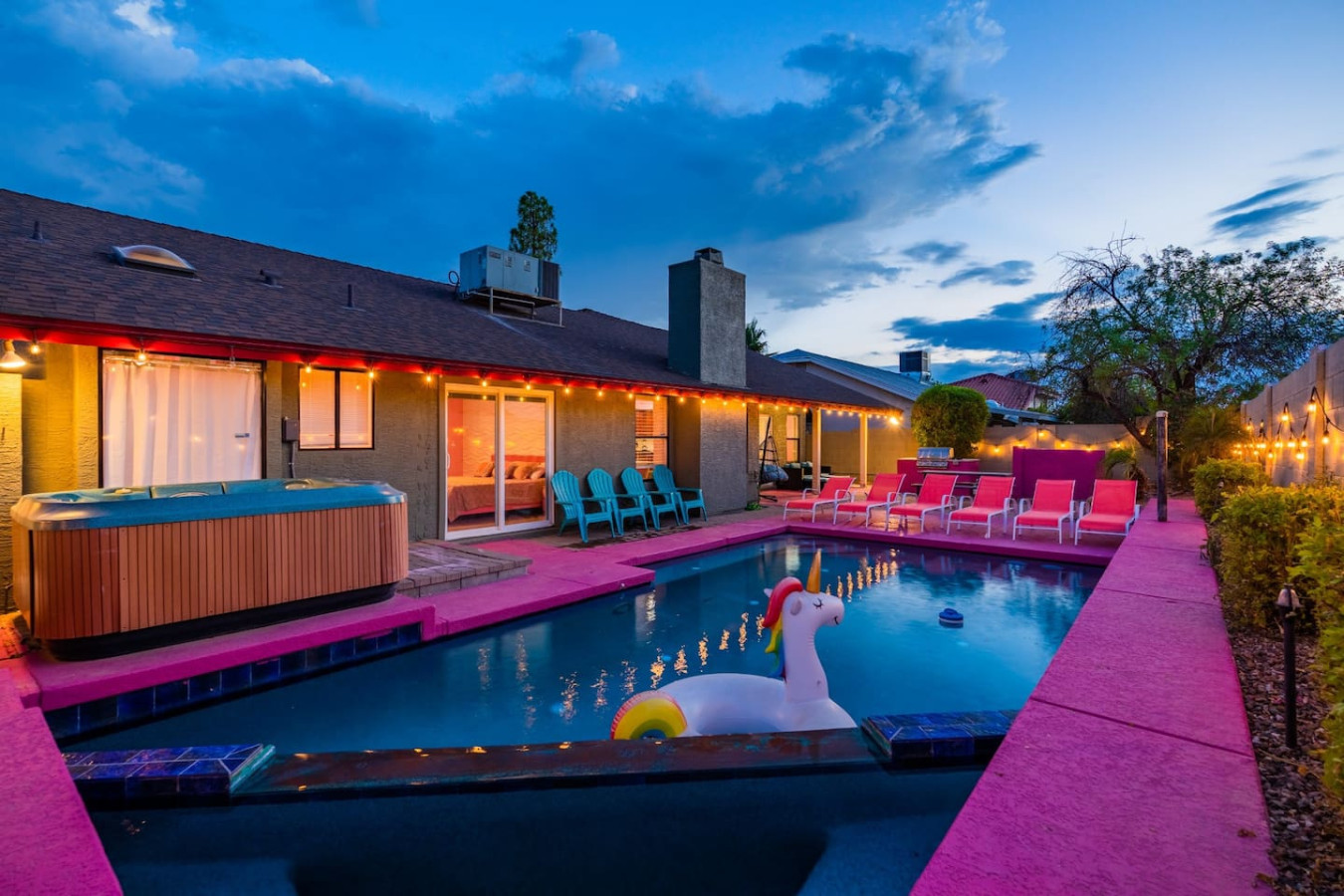 Welcome to our delightful and newly renovated 3 bedroom, 2 bathroom Barbie-themed home in Scottsdale, Arizona. Our home is located in a prime zip code and features a variety of amenities and a beautiful outdoor space that are perfect for small and la...rge groups. Discover the best home with pool, hot tub, arcade, and home theater! Immerse yourself in the architectural wonder of Taliesin West, Frank Lloyd Wright's masterpiece, or explore the scenic trails of McDowell Sonoran Preserve. HOT TUB is currently out of order. POOL - Relax and unwind in our luxurious outdoor pool and hot tub area. The pool is not gated, so guests have easy access to the refreshing water anytime. The hot tub is located within the pool area and is the perfect spot to soothe tired muscles after a long day. Soak up the sun on the deck or lounge on one of the poolside chairs. This is the ultimate spot for relaxation and fun during your stay. ARCADE GAME - We also have an arcade and game room for entertainment. The powder/makeup room is an ideal space for getting ready for a night out; and our fast and reliable WiFi ensures you can stay connected during your stay. BEDROOMS - Our comfortable beds are the perfect way to end the day and ensure a restful night's sleep. KITCHEN - The kitchen is fully equipped in preparing your meals, including microwave, blender, coffee maker, and stove. HOME THEATER - Watch your favorite show or movie with your friends and family. The guest can access the whole house including the home theater, pool and hot tub! ♡ There are many near restaurants and bars you can visit. Some popular options might include: * The Roost: A popular spot for breakfast and lunch with a variety of sandwiches, salads, and eggs dishes. * SuperFarm SuperTruck: A unique food truck serving locally-sourced, organic dishes made with ingredients from their own farm. * The Odysea Lounge: A trendy bar and restaurant with a diverse menu of small plates, sandwiches, and entrees, as well as a wide selection of cocktails and beers. * The Mission: A popular spot for contemporary Latin cuisine, with a menu featuring tacos, ceviche, and entrees like short rib and salmon. * The Arrogant Butcher: A lively restaurant and bar known for its steaks, sandwiches, and craft cocktails. There are also scenic views near the listing, some popular options might include: * Camelback Mountain: Located just a few miles from the school district, this iconic mountain is a popular spot for hiking, with trails that offer panoramic views of the valley. * Pinnacle Peak Park: This park is known for its beautiful desert scenery, with hiking trails that lead to a peak with breathtaking views of the surrounding area. * Desert Botanical Garden: This 140-acre garden is home to a variety of cactus, succulents, and other desert plants, as well as walking trails that offer views of the surrounding landscape. * Scottsdale's McDowell Sonoran Preserve: This vast preserve is home to a variety of desert plants and animals, and features more than 200 miles of trails that offer stunning views of the Sonoran Desert. These are just a few examples, and there are many other great restaurants, bars and views to choose from in the area. PERMITS & LICENSES: - STR: 2027302 There are several ways to get around the neighborhood. Some options might include: * Walking: Depending on where you're staying, you may be able to walk to local restaurants, shops, and other attractions. * Biking: The area may have bike lanes or trails that you can use to get around. You could also rent a bike from a local shop or use a bike-sharing service. * Public transit: The area may have buses or other forms of public transportation that you can use to get around. * Driving: You can use your own car or a ride-sharing service like Uber or Lyft to get around the neighborhood. In terms of parking, it will depend on where you are going and the specific parking options available. Some restaurants, shops, and other attractions may have their own parking lots or garages, while others may have street parking available. - Minutes away from Waste Management We’ve partnered with Truvi / Know Your Guest to ensure a safe and enjoyable experience for all our guests, while also complying with Arizona law. Rest assured, your data is handled securely with them. While these options provide added peace of mind, we kindly ask that you care for the property as if it were your own. Leaving excessive trash or causing avoidable damage is discouraged to avoid any additional fee and maintain a welcoming space for everyone.