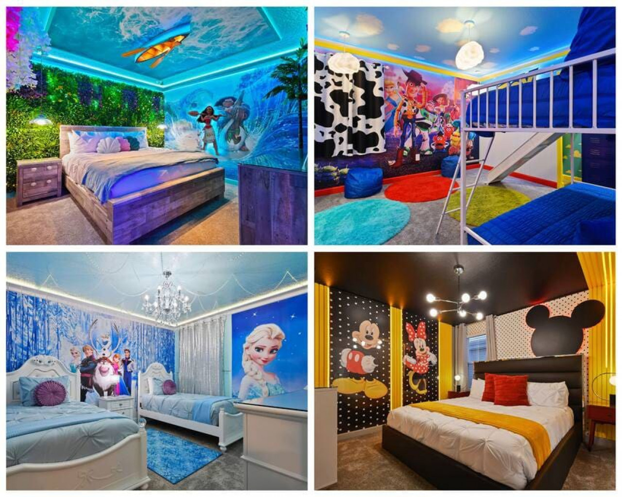 SCAN QR CODE for a VIRTUAL TOUR. Experience luxury and entertainment in this 9-bedroom villa that has 7 different themed rooms, a private pool/hot tub, and unobstructed lake views. Enjoy our Avengers movie room, Star Wars game room, Harry Potter, Fr...ozen, Toy Story, Moana, Mickey bedrooms and 2 exclusive Clubs. Located just 7 miles from Disney and 12 miles from Universal Studios, this gem is ideal for families and folks seeking a luxurious and fun vacation that will be memorable for a lifetime. Step into a world where fantasy and luxury intertwine, a haven where imagination knows no bounds, and dreams come alive. As you open the door to this magical retreat, prepare to be captivated by the stunning themed Disney rooms that await you. Each room is a tribute to beloved characters and stories, meticulously crafted with attention to detail, transporting you to a realm of wonder and nostalgia. From the elegant Frozen inspired palace and the captivating Hogwarts Express to the jaw dropping Avengers cinema and the Star Wars game room, every corner of this home is a testament to the enchantment that Disney and Universal bring. *LIVING ROOM* The bright, open concept living areas gives you a stylish space to come together with friends and family on the oversized leather sectional and inviting accent chairs that surround the large wall mounted TV. Outside you will find yet another living area by the pool with a sliding glass door separating the two spaces giving you the perfect indoor to outdoor living experience. *KITCHEN AND DINING* The gourmet kitchen has everything you need to create all your family favorites be it a stack of Mickey pancakes for breakfast or a 3-course meal in the evening to round out a perfect day. You will have access to high-end appliances, a coffee machine to get your day started right and a large French door fridge with filtered water and ice dispenser along with plenty of quality utensils, cookware and dinnerware to make entertaining a breeze. Eat together at the stylish dining table with extra seating at the sleek stone breakfast bar or on a sunny day take your meals outside and eat alfresco by the pool with a TV overhead to keep the little ones entertained. 1. Gourmet Kitchen 2. Stainless Steel Appliances 3. Refrigerator/Freezer with Ice/Water dispenser 4. Coffee Maker 5. Elegant Dining Area 6. Breakfast Bar Seating 7. Poolside Alfresco Dining *BEDROOMS* Whether you are looking to be transported to a place where your favorite Disney characters come to life in each of the meticulously designed themed bedrooms or are looking to escape into a luxurious sanctuary with gleaming chandeliers and king canopy beds - you will find all this and more waiting for you to experience. Each bedroom comes equipped with hotel-quality beds topped with soft linen for a restful night's sleep. Smart TVs and plenty of space to relax, unpack and make yourself at home. 1. Master Bedroom ("Serenity") - King Canopy Bed with Smart TV and Ensuite Bathroom 2. Bedroom Two ("Eclectic") - King Bed with Smart TV and Ensuite Bathroom 3. Bedroom Three ("Oasis") - King Bed with Smart TV and Ensuite Bathroom 4. Bedroom Four ("Mouses") - Mickey and Minne themed bedroom with King Bed with Smart TV and Ensuite Bathroom 5. Bedroom Five ("Sunshine") - King Bed with Smart TV 6. Bedroom Six ("Moana") - Moana themed bedroom with King Bed with Smart TV 7. Bedroom Seven ("Frozen") - Frozen themed bedroom with Two Twin Beds and Ensuite Bathroom 8. Bedroom Eight ("Harry Potter") - Harry Potter themed bedroom with Three Full Beds and Smart TV 9. Bedroom Nine ("Toy Story") - Toy Story themed bedroom with Twin Bunk Beds and Ensuite *BATHROOMS AND LAUNDRY* You will find five sparkling bathrooms within the home including lavish his and hers ensuites off the king bedrooms and a spacious family bathroom in the hall. Each bathroom gives you a spa like experience with oversized showers, relaxing full-size baths and vanities stocked with quality amenities and plenty of soft, fluffy towels for your stay. Guests also have full access to the laundry with a washing machine and dryer along with complimentary washing detergent to keep you feeling fresh and clean during your stay. 1. Soft Fluffy Towels 2. Quality Bathroom Essentials 3. Soap, Shampoo, Conditioner and Bodywash 4. Oversized Showers and Relaxing Baths 5. Washing Machine and Dryer *GAMES ROOM AND CINEMA* When entertainment is high on your must have list, this villa does not disappoint with a state-of-the-art Avengers cinema waiting for your next private screening! The cinema seats six guests on luxe leather recliners where you can put your feet up and feel like you are a VIP surrounded by all your favorite Avengers characters and a captivating starry galaxy above. Star Wars fanatics will be in heaven when they step inside the fully decked games room complete with spaceship interior design, an air hockey table, s foosball table, bar seating and a gaming station to let our inner Jedi. 1. Amazing Avengers Six Seat Cinema 2. Luxury Leather Recliners 3. Star Wars Themed Game Room 4. Gaming Station 5. Foosball and Air Hockey Tables *OUTDOORS* Soak up the endless Florida sun in one of the many lounges that surround the pool in your own private screened in oasis. Here you can take a dip in the pool, luxuriate in the inviting hot tub, sip drinks and relax, while taking in the stunning views of the Lake and Sunsets! 1. Screened in Pool/Spa 2. Alfresco Dining Area 3. Outdoor Lounge 4. Lake Views *RESORT AMENITIES* Included within your stay is full use of the 5-star Storey Lakes Resort amenities including stunning pools, a water park, playgrounds, restaurants, gyms, clubhouses, Mini golf and so much more awaiting your Discovery. Disney themed parks are only 15 minutes' drive away from the resort along with Universal Studios, Sea World, outlet shopping, countless restaurants, cafe and everything Orlando has to offer giving you a central base close to all the top attractions. So if you 