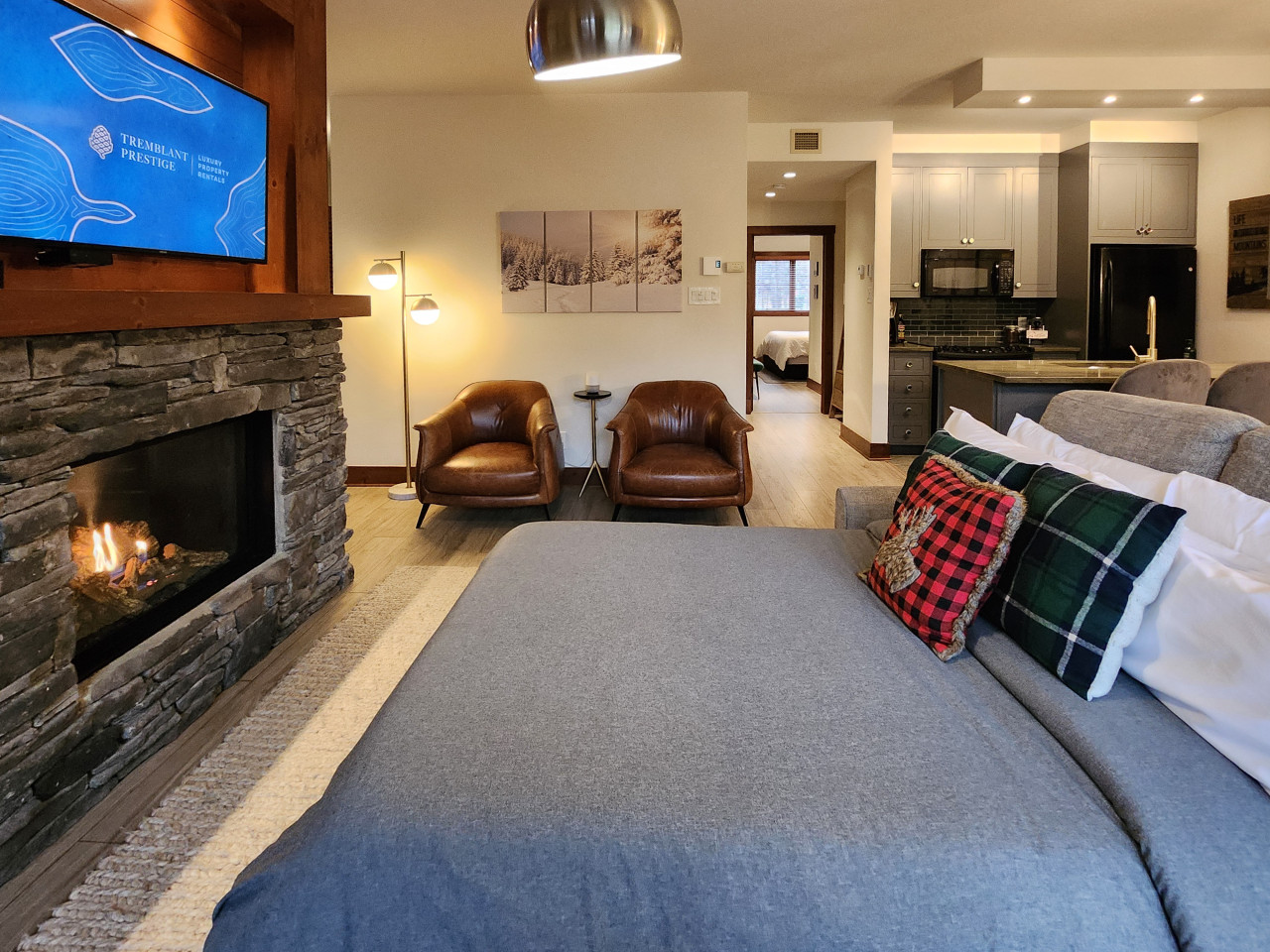 If you're a nature enthusiast, the Etoile Du Matin 1520 3 is the perfect accommodation for you! This luxurious condo, located at the base of the mountain on Versant Soleil, offers breathtaking views of the surrounding mountains and is just a quick sh...uttle or gondola ride away from the pedestrian village. This spacious 2-bedroom, 2-bathroom condo spans across 1100 square feet and can comfortably accommodate up to 6 guests. The master bedroom is furnished with a king-size bed, a TV, and an ensuite bathroom that features a shower/bathtub combo. The second bedroom has a queen-size bed and bunk beds (single-single), while the second bathroom has a shower. The condo boasts numerous amenities that ensure a comfortable and enjoyable stay. Guests can take advantage of the shared pool and hot tub or ski in and out of the condo. The heated garage and ski locker provide convenient storage for skiing equipment. Other amenities include a smart TV, gas fireplace, and unlimited Wi-Fi access. The fully equipped kitchen allows guests to prepare their own meals, and there's a dining table that seats 6. The terrace, complete with a year-round BBQ, is perfect for outdoor dining and admiring the view. Additionally, the condo offers free parking and air conditioning. For those feeling lucky, there's even a casino nearby. Book your stay at Etoile Du Matin 1520 3 and immerse yourself in the natural beauty of the area while enjoying all the comforts of home! FAQ What is the walking distance from the pedestrian village (restaurants and shops)? need to use the casino shuttle. Ski/in ski out: The access depends of snow falls but unusually open mid-December up to bigging of April. To verify you can contact Station Tremblant. Early Check-in/Check-out: Is it possible to have an early check-in or check-out? Yes, if available. However, confirmation cannot be guaranteed more than 1 day in advance. Coffee: What type of coffee makers are provided at the property? We have a Nespresso machine that uses small pods and comes with a milk frother. Additionally, there is a drip machine with a coffee grinder. Property items: What items are provided at the property? We provide fresh coffee beans, a box of Nespresso pods, sugar, salt and pepper, olive oil, basic spices, dish and dishwasher soaps, garbage and recycling bags, 3 rolls of toilet paper per bathroom, laundry detergent, 1 roll of paper towels, and all-purpose cleaner. Check-in procedures: What are the check-in procedures? You will receive a detailed email at least 3 days prior to your arrival with all the information you need. Parking: We have more cars than the number of parking spots provided. What should we do? There are many public parking options available in Tremblant, most of which are free, such as P1 and P2. everything! always available for assistance on the versant Soleil next to the casino. Swimming pool and whirlpool: -The swimming pool is only open in summer -Opening hours are 11 a.m. to 7 p.m. for the whirlwind -A maximum of 10 people inside the enclosure will be allowed. (RBQ requirement) -All people aged 12 and under must be accompanied by an adult and children aged 7 and under must be in the care of a responsible adult at all times. -Wearing a swimsuit is obligatory. -No food and glass containers will be allowed. Citq 237075