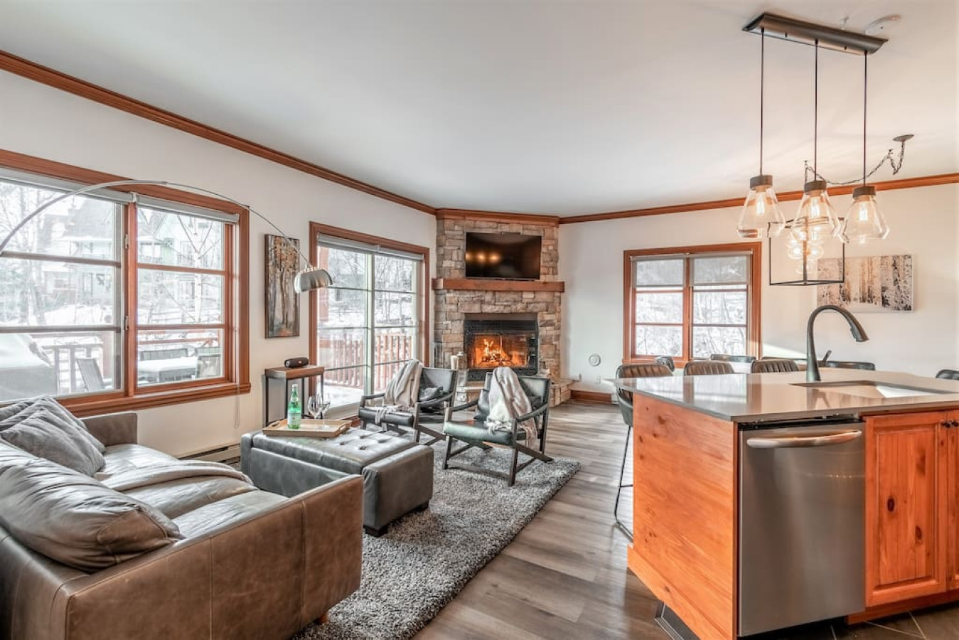 Experience the best of Mont-Tremblant by staying in our comfortable and spacious condo, The Plateau 230-3. With two bedrooms and two bathrooms, our condo can easily accommodate up to six guests. Located in the serene Le Plateau family development, yo...u'll be in close proximity to the bustling pedestrian village of Tremblant, while still enjoying peace and tranquility. Winter enthusiasts will appreciate the easy access to the ski area and the skating rink in the yard. Meanwhile, summer lovers will be delighted to discover a picturesque pond and waterfall just steps away. You can even go hiking directly from the condo or spend a day relaxing at the refreshing pool. Our space has recently been renovated to offer the best possible experience. The fully equipped kitchen includes a Nespresso coffee machine with milk frother, perfect for whipping up a feast. The cozy dining room can comfortably seat up to eight guests. After a day full of activities, you can relax in the comfortable living area in front of a real wood-burning fireplace or enjoy the sounds of the stream from the balcony, where you can barbecue all year round. Additionally, we have a large ski locker to store all your gear. The master bedroom boasts a spacious king-size bed and an en-suite bathroom, while the second bedroom features a bunk bed with a queen bed and a double bed on top, with a nearby second bathroom. We invite you to come and experience our little corner of paradise at The Plateau 230-3. Book now for an unforgettable Mont-Tremblant getaway! FAQ What is the walking distance from the pedestrian village (restaurants and shops)? 15-20 minutes Ski/in ski out: The access depends of snow falls but unusually open mid-December up to bigging of April. To verify you can contact Station Tremblant. Early Check-in/Check-out: Is it possible to have an early check-in or check-out? Yes, if available. However, confirmation cannot be guaranteed more than 1 day in advance. Coffee: What type of coffee makers are provided at the property? We have a Nespresso machine that uses small pods and comes with a milk frother. Additionally, there is a drip machine with a coffee grinder. Property items: What items are provided at the property? We provide fresh coffee beans, a box of Nespresso pods, sugar, salt and pepper, olive oil, basic spices, dish and dishwasher soaps, garbage and recycling bags, 3 rolls of toilet paper per bathroom, laundry detergent, 1 roll of paper towels, and all-purpose cleaner. Check-in procedures: What are the check-in procedures? You will receive a detailed email at least 3 days prior to your arrival with all the information you need. Parking: We have more cars than the number of parking spots provided. What should we do? There are many public parking options available in Tremblant, most of which are free, such as P1 and P2. **The pool is open during summer only Guests have they entire condo Always just a text away The plateau is unique. it like a resort in a resort. walking distance to the village or a short free shuttle ride The plateau is unique. it like a resort in a resort. Pool and whirlpool is open only in summer. Citq 249815