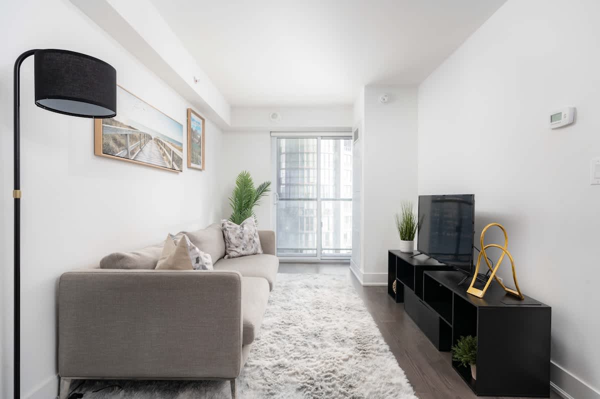 Discover the perfect blend of comfort and convenience in our chic 1BR condo with a den, ideally located in downtown's vibrant heart. Steps from the CN Tower, Rogers Centre, and Scotia Bank Arena, our space is a haven for both leisure and business t...ravelers. Enjoy a stylish interior with a cozy queen bed and sofa bed, a full kitchen, and high-speed Wi-Fi. Whether you're exploring the city's rich culture or unwinding in our serene retreat, your stay promises to be memorable Our inviting condo offers a warm and modern space that caters to both comfort and style. The property features: - Living Room: A bright and airy space with large windows that flood the room with natural light. It’s furnished with a comfortable sofa that doubles as a bed, a flat-screen TV, and tasteful decor, creating a relaxing environment for unwinding after a day in the city. - Bedroom: The bedroom boasts a luxurious queen-sized bed with high-quality linens, ensuring a restful night's sleep. It's equipped with ample closet space, perfect for storing your belongings during your stay. - Den: This additional room serves as a versatile space, ideal for reading, working, or simply enjoying some quiet time. It features a desk and a cozy chair, making it a great spot for those who need to stay connected or productive. - Kitchen: Fully equipped with modern appliances, including a refrigerator, stove, microwave, and coffee maker. The kitchen has all the essentials for cooking and dining in, whether you’re preparing a quick breakfast or a full meal. - Bathroom: A clean and well-maintained bathroom with a shower/tub combination, stocked with fresh towels and basic toiletries for your convenience. - Additional Features: High-speed Wi-Fi throughout the condo, an in-unit washer and dryer, and central heating and air conditioning to ensure your utmost comfort regardless of the season. This condo is designed to be a seamless blend of functionality and comfort, making it an ideal space for both short-term and extended stays. Whether you’re here for business or pleasure, our property offers a tranquil and convenient base for your adventures in the city. As our valued guest, you will have full and exclusive access to the entire condo, ensuring a private and uninterrupted stay. This includes: - The Entire Living Space: Enjoy the comfort and privacy of the living room, bedroom, den, kitchen, and bathroom. The space is entirely yours to relax, work, cook, and live in during your stay. - Laundry Facilities: You have access to in-unit laundry facilities, including a washer and dryer. Feel free to use these for your convenience during your stay. Please treat the space with the same respect you would your own home and enjoy all the comforts it has to offer. We strive to ensure that your stay is as comfortable and enjoyable as possible. As your host, while I might not be physically present, I'm always just a message away! I'm readily available and quick to respond should you need anything during your stay. From queries about the suite to recommendations about the local area, don't hesitate to get in touch. Your comfort is my top priority, and I'm dedicated to ensuring you have a smooth, enjoyable stay at our place. Welcome to a vibrant and dynamic neighborhood, perfectly positioned in the heart of downtown. This area is renowned for its bustling atmosphere and proximity to some of the city's most iconic attractions: - Iconic Landmarks: Just steps away, you'll find the awe-inspiring CN Tower, offering breathtaking views of the city. The Rogers Centre and Scotia Bank Arena are also nearby, a hub for major sports events and concerts. - Cultural Hotspots: The Scotia Bank Arena, a premier venue for top-tier concerts and events, is within walking distance. Additionally, the area is dotted with numerous art galleries and theaters, showcasing the city's rich cultural scene. - Dining and Nightlife: The neighborhood is a food lover's paradise with a diverse range of dining options, from upscale restaurants to casual eateries and charming cafes. The nightlife is vibrant, with plenty of bars and clubs offering a variety of experiences. - Shopping: Indulge in retail therapy with a range of shopping destinations, including boutique stores and well-known retail outlets. - Parks and Recreation: Enjoy the green spaces nearby for a morning jog or a leisurely stroll. The waterfront offers scenic walks and is a great spot to unwind. - Transportation: The area boasts excellent public transportation links, making it easy to explore the wider city. Bike-sharing stations and pedestrian-friendly streets also make it convenient to navigate the neighborhood. This neighborhood is not just a place to stay; it's a bustling, lively community that offers an authentic experience of city living. Whether you're here for leisure, business, or a bit of both, you'll find yourself at the center of it all. Navigating this vibrant neighborhood and beyond is a breeze, thanks to its excellent location and a variety of transportation options: - Public Transit: The area is extremely well-connected with public transit. Multiple bus routes and streetcar lines run through the neighborhood, and subway stations are just a short walk away, making it easy to explore the city without a car. - Walking and Biking: The neighborhood is very pedestrian-friendly, with most major attractions, shops, and restaurants within walking distance. For a quicker pace, consider using the city's bike-sharing program, which has several stations nearby. - Ride-Sharing and Taxis: Ride-sharing services like Uber and Lyft operate extensively in the area, offering a convenient and quick way to get around. Taxis are also readily available. - Parking: If you're driving, please note that while the condo doesn’t provide on-site parking, there are multiple paid parking options nearby. You can find both street parking and several secure parking garages in the vicinity. Be mindful of parking signs and regulations to