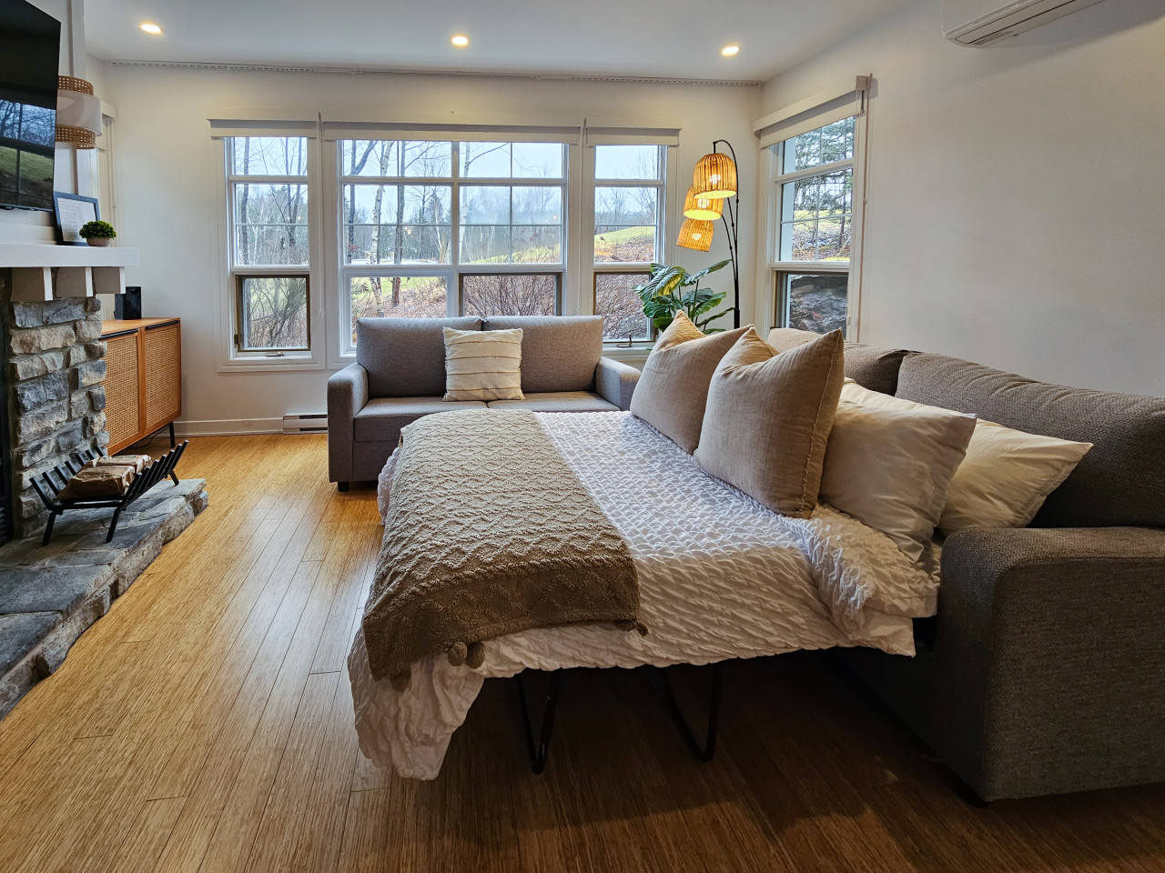 Welcome to your ultimate vacation retreat at Tremblant Les Eaux 227-6! This luxurious vacation rental offers a sublime experience with its high-end furnishings and impeccable amenities. With 2 bedrooms and 2 bathrooms, it provides ample space and com...fort for your stay. Indulge in the refreshing pool during the summer months, or unwind in the hot tub and sauna, available to you all year round. The year-round BBQ area is perfect for enjoying delicious meals and soaking up the beautiful surroundings. Situated in close proximity to the pedestrian village, you'll have easy access to an array of restaurants, shops, and entertainment options. For golf enthusiasts, the resort is conveniently located beside a stunning golf course, offering a picturesque setting for your outdoor adventures. Retreat to the master bedroom, featuring a lavish king-size bed for a restful night's sleep. The second bedroom also boasts a comfortable king-size bed, ensuring everyone in your group enjoys a comfortable stay. Stay cool during warmer days with the provided air conditioning. The fully equipped chef kitchen is a dream come true for culinary enthusiasts, allowing you to prepare delicious meals with ease. The spacious living room is equipped with a huge TV and a real wood fireplace, perfect for movie nights and relaxation. Both bedrooms also feature their own TVs, ensuring entertainment for all. Convenience is key, and this vacation rental includes an in-unit washer and dryer for your laundry needs. Step outside to the furnished terrace and breathe in the fresh air while taking in the natural beauty that surrounds you. Enjoy the added convenience of a free shuttle service, providing easy transportation to and from the resort. Immerse yourself in nature and embrace the tranquility that Tremblant Les Eaux offers, where every breath is filled with fresh air. FAQ What is the walking distance from the pedestrian village (restaurants and shops)? 15 minutes Early Check-in/Check-out: Is it possible to have an early check-in or check-out? Yes, if available. However, confirmation cannot be guaranteed more than 1 day in advance. Coffee: What type of coffee makers are provided at the property? We have a Nespresso machine (Vertuo). Additionally, there is a drip machine with a coffee grinder. Property items: What items are provided at the property? We provide fresh coffee beans, sugar, salt and pepper, olive oil, basic spices, dish and dishwasher soaps, garbage and recycling bags, 3 rolls of toilet paper per bathroom, laundry detergent, 1 roll of paper towels, and all-purpose cleaner. Check-in procedures: What are the check-in procedures? You will receive a detailed email at least 3 days prior to your arrival with all the information you need. Parking: We have more cars than the number of parking spots provided. What should we do? There are many public parking options available in Tremblant, most of which are free, such as P1 and P2. schedule -Aquatic facilities The swimming pool is only open in the summer. Saunas and spas: Opening hours are from 10 a.m. to 10 p.m. every day of the year. Citq 251694