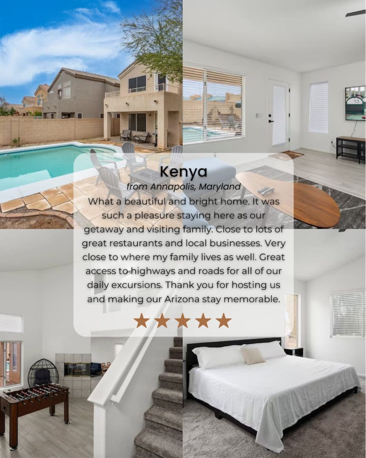 Game Room~Heated and Chilled Pool~Western Spectacular Sunsets~Corner Lot~Stadiums Close~Walking Paths~Outdoor TV's~Nascar~Frisbee Golf~Suns~ This home has something for everyone literally. So close to everything the Phoenix Area has to offer. Step... inside to a contemporary home with recent updates throughout. You will be welcomed to a family room with plenty of cozy seating for everyone anchored by a massive TV to catch a movie. The sofa opens into a bed for extra sleeping accommodations. The open concept kitchen dining and game room are to the left with massive windows letting in tons of natural light. The kitchen is well stocked with everything you will need to get your inner chef on or prep for an outdoor BBQ. The game room has a pool table, TV and more fund games. The dining room is seats 8, so everyone will have a place at the table and there is a breakfast bar too for casual dining. Down the hall you will find the 4 bedrooms. The Primary bedroom is in the rear of the home with a spa like bath attached. It has a king bed with luxurious linens and a super sized TV. The office open bedroom is next door with a twin bed and TV and bedrooms 2 and 3 both have queen beds, TV's and are super homey. Now for the glorious outdoors. This backyard oasis will be sure to help you make beautiful memories. The heated and chilled pool will allow for year round fun. There is an outdoor living room with TV, and an outdoor kitchen with built in BBQ and another TV so you will not have to miss any of the action. Grassy area, yard games, and an open area to the west make your sunset views totally unobstructed. Home also features super fast wifi, a two car garage and full sized indoor laundry room. Book today, this one won't last. WOOF! This home is dog friendly. A total of one dog will be welcome for $25 per night pet fee or for those guests staying 30+ nights the pet fee is reduced to $10 per night. Goodyear! This up and coming city is only 20 minutes from downtown Phoenix. It is filled with shopping, restaurants, the Goodyear MLB Spring Training Stadium for the Cleveland Guardians and the Cincinnati Reds. It is also close to Glendale where the Arizona Cardinals play. Elite Weather Pool Heater Guarantee: Splash. Thinking of booking October 15-April 15? The weather in Arizona can be quite volatile this time of year. There may be soaring heats over 100 degrees or temps that can drop below 50 degrees. This home is equipped with a heat pump, reel and cover. The heat pump that is responsible for heating the pool is at full efficiency if the weather stays above 50 degrees allowing the pool to get to a comfortable swimming temp of 85 degrees. Should you want the pool heated, please book with that option now. As your reservation date approaches, should you find the temps heading below 50 degrees you can make a final decision if you wish the pool to be heated based on weather conditions. We can refund the pool heat fees should you be concerned about not being able to enjoy this amenity as intended. This pool is equipped with a heated pool and pool heating is optional. The cost for pool heat is $70.20 per day. Should the home be equipped with a spa or hot tub, the cost to heat the spa or hot tub is included in the rental amount year round. City Code Enforcement: As part of our commitment to being good neighbors, occupancy limits and quiet hours (9pm-8am) are strictly enforced. No speakers or sound systems will be provided for use in our properties. Violation of any noise ordinances will be subject to fines that can reach up to $10,000 per violation. Events or parties are not allowed without prior written approval and an additional fee. Any unauthorized parties or events will be shut down and a fine will be assessed. Please inquire for more information about our event policies and fees. Accidental Damage Protection: A non-refundable accidental damage protection plan has been included in the price of your reservation. Under this plan, you will not be held responsible to pay for accidental damage or loss to the rental property resulting from you or others in your party up to $3000. This plan does not cover intentional acts of a guest, gross negligence, or willful and wanton conduct, and/or damages caused by pets. Air Conditioning: Please note A/C cannot go below 70 degrees as this freezes out the units and causes issues. For stays of over 30 nights, an electricity cap has been determined as presented in your rental agreement. 24/7 Care for our Guests. We are always available to you through text and phone, as well as 24 hour Concierge Service! We report and prosecute all Credit Card Fraud. Arizona Transaction Privilege License #: 21514168