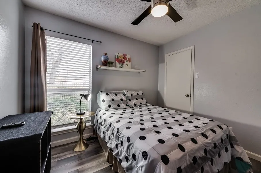 Ground floor Condo in a gated community. Features include: fully-equipped kitchen with full-sized appliances, an in-unit washer/dryer, & a pool. Decorated in serene grays with vibrant accents, it features modern amenities, stainless steel appliances,... & contemporary furniture, creating a perfect haven for relaxation after a busy day. Easy access to HWY 183 &161, and DFW Airport. Review the 'OTHER THINGS TO NOTE' section. The space This ground-floor condo offers an expansive living area of approximately 660 square feet. Inside, you'll find exquisite hardwood flooring, a generously sized kitchen equipped with full-sized stainless steel appliances, and modern furnishings that complement the space's contemporary design. Entertainment is at your fingertips with a large flat-screen television that provides access to hundreds of cable channels via ROKU. Additionally, you can enjoy live TV through the Spectrum TV subscription service, making it easy to access your preferred online streaming channels. Bedrooms are also equipped with their own TVs for your relaxation. For traveling professionals, we've thoughtfully included a comfortable desk and chair, creating a convenient workspace right within the unit. Everything you need for a comfortable stay is at your disposal, from a full-size washer and dryer to a well-stocked kitchen with dining and cooking utensils. Guest access During the summer season, you can enjoy access to the pool for relaxation and recreation. Your convenience is ensured with assigned covered parking, and there's also a designated green space where you can take your pets for a leisurely stroll. Other things to note IDs and Occupant Forms: Submit government IDs and occupant info within 24 hours of booking. Pets: Declare pets before booking. Fees: $250 for 1st pet, plus $150 for the 2nd pet (max 2). Weight and breed restrictions apply. Community Rules: Keep the community clean, leash dogs outside, and keep cats indoors. Balcony Safety: Use safety gates for young children. Parking Rules: Use designated spots, avoid fire lanes, handicap areas, and untagged reserved spots. Request a reserved space if needed. Note: Nabro Furnished Housing is not liable for towing fees. Lost Keys/Fobs: $100 fee for lost keys or fobs. Utilities: Rent covers $125 for a 2-bedroom unit, incl. electricity, water, trash, and Internet. Conserve to reduce impact; actual costs may vary based on circumstances and rates.