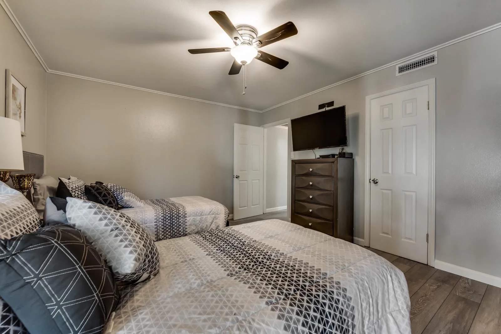 Discover comfort in this upgraded 2nd-floor 2BD, 2BA unit (1049 sqft) in Grand Prairie. It features a well-equipped kitchen, a washer/dryer, & a cozy patio. Unwind in the living room on a comfortable sofa, & enjoy meals at the 4-person dining table. ...For entertainment, there's a 55" TV with cable in the living room. Explore nearby attractions like River Legacy Nature Center & River Legacy Park. Review the 'Other Things to Note' section. The Space The primary bedroom showcases a roomy King-sized bed, whereas the second bedroom provides versatile twin beds that can merge into another King. Modern exposed lighting, plush tufted headboards, and refined silver accents enrich the bedroom aesthetics. All bedrooms come with a 43" TV, and a sizable 55-inch TV adorns the living space. Enjoy complimentary high-speed Wi-Fi throughout. Other things to note IDs and Occupant Forms: Submit government IDs and occupant info within 24 hours of booking. Pets: Declare pets before booking. Fees: $250 for 1st pet, plus $150 for the 2nd pet (max 2). Weight and breed restrictions apply. Community Rules: Keep the community clean, leash dogs outside, and keep cats indoors. Balcony Safety: Use safety gates for young children. Parking Rules: Use designated spots, avoid fire lanes, handicap areas, and untagged reserved spots. Request a reserved space if needed. Note: Nabro Furnished Housing is not liable for towing fees. Lost Keys/Fobs: $100 fee for lost keys or fobs. Utilities: Rent covers $200 for a 4-bedroom unit, incl. electricity, water, trash, and Internet. Conserve to reduce impact; actual costs may vary based on circumstances and rates.
