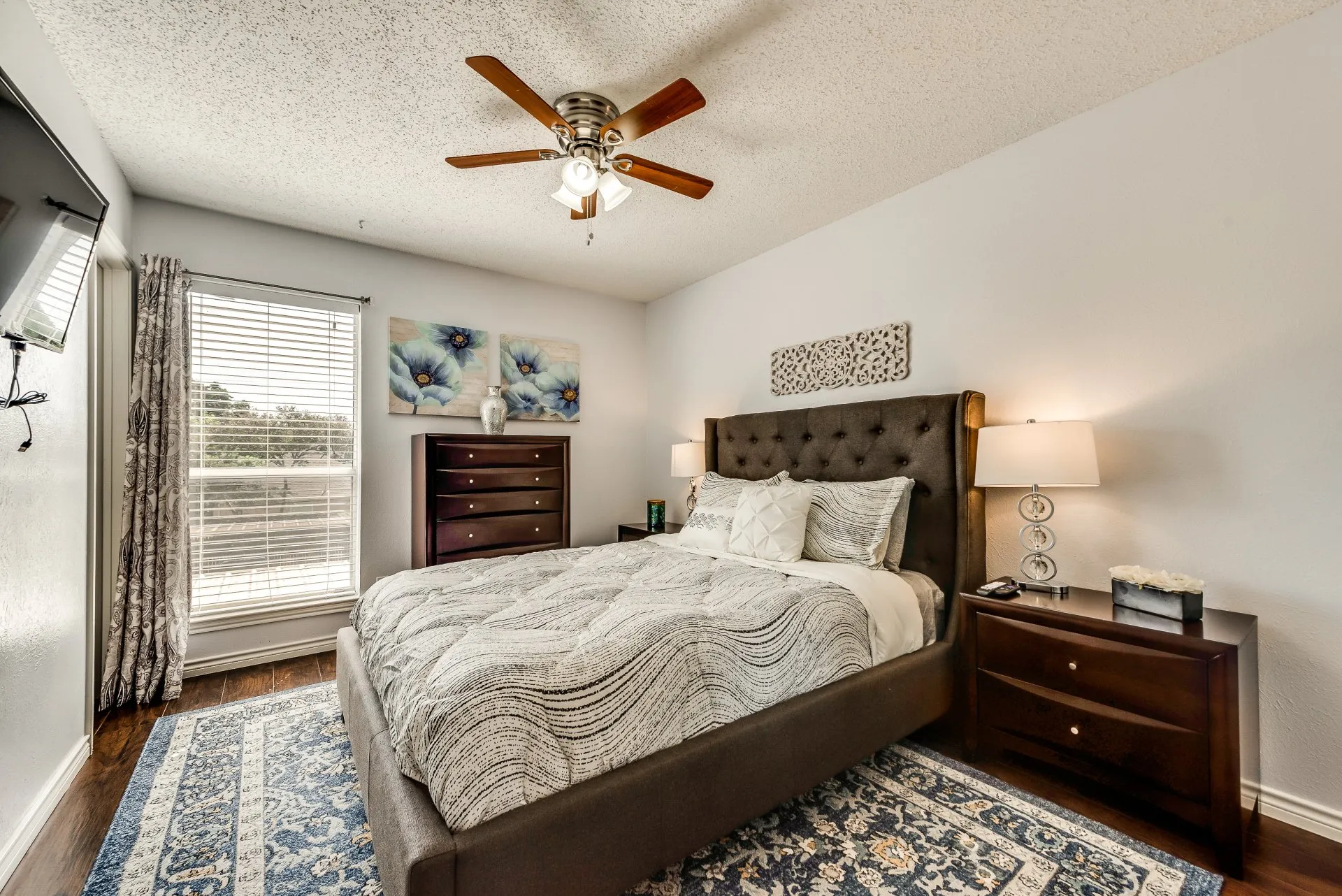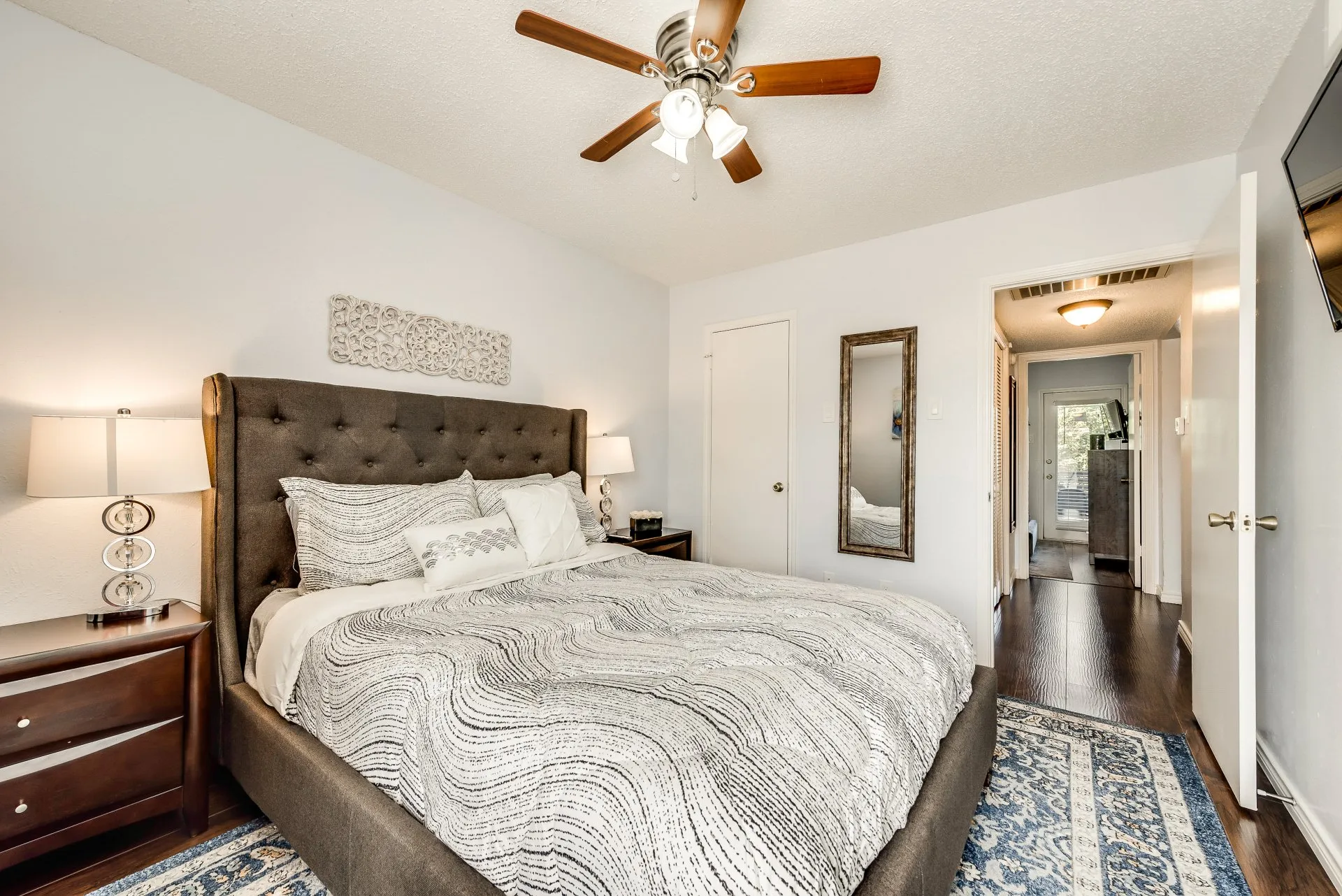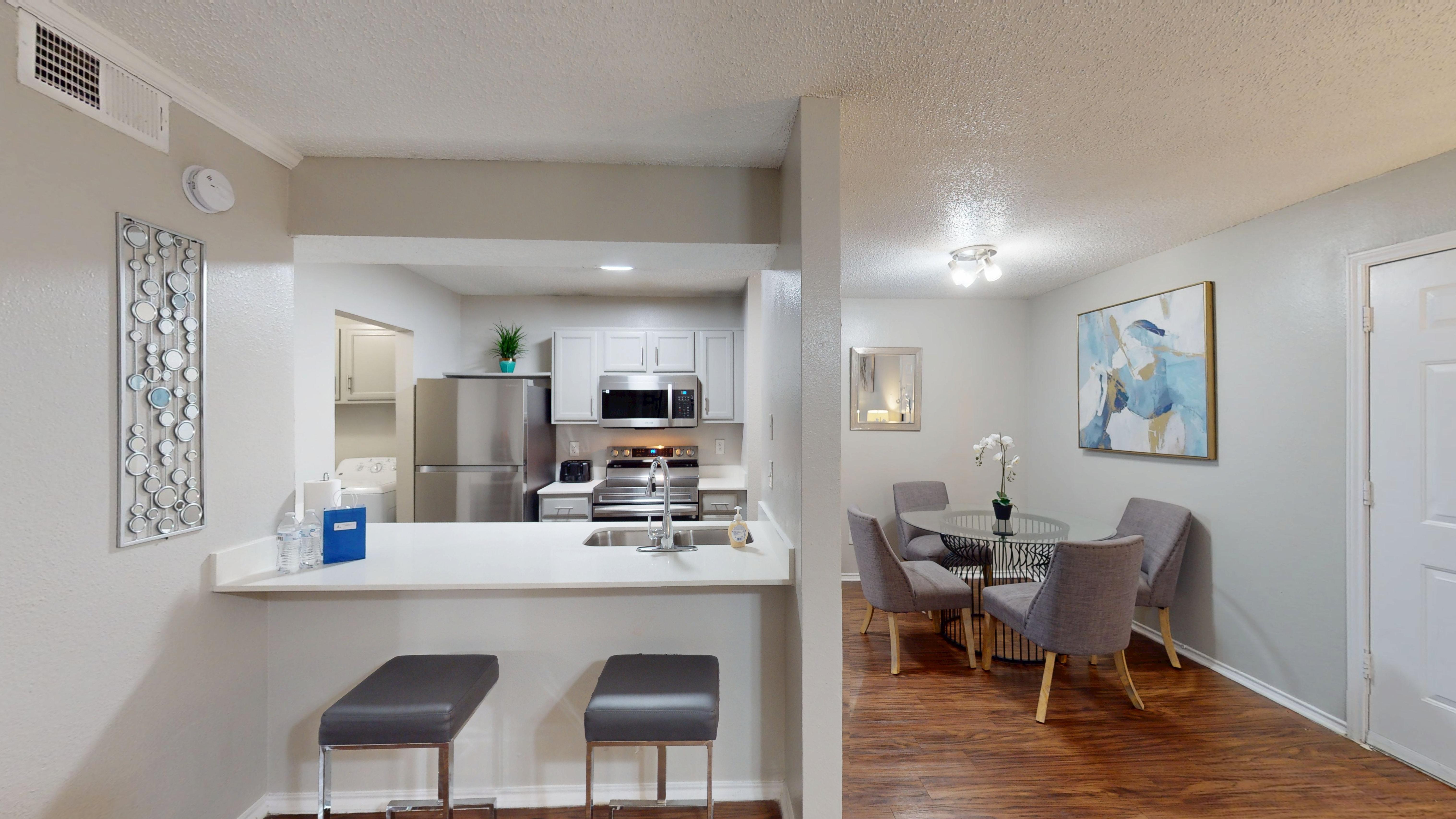 Relax in this tranquil 2BD/2BA 2nd-floor condo with a queen and full beds, in a gated community. Discover a fully-equipped kitchen with full-sized appliances, an in-unit washer/dryer, & access to a pool. Decorated in serene blues and grays with vibra...nt accents, it features a patio, contemporary furniture. Enjoy easy access to Highway 183 and 161, DFW Airport, Towne Lake Park etc. Review the "OTHER THINGS TO NOTE" section for more details. The space Situated on the second floor with a view of the pool, this condo boasts hardwood flooring and stylish Metro tiles in both bathrooms, lending a brick-like charm. It offers all the essential amenities for traveling professionals or small families. The condo's proximity to the West Irving Station on the TRE train system, Towne Lake Park with its playgrounds and lakes, as well as popular restaurants and shopping options, makes it a convenient choice. Access to major highways such as 183, the PGB Turnpike, and the 360 is a breeze. Enjoy high-speed WiFi and Smart TVs with cable channels, including streaming services like Netflix, Hulu, and more for your entertainment needs. Guest access During the summer season, you can enjoy access to the pool for relaxation and recreation. Your convenience is ensured with assigned covered parking, and there's also a designated green space where you can take your pets for a leisurely stroll. Other things to note IDs and Occupant Forms: Submit government IDs and occupant info within 24 hours of booking. Pets: Declare pets before booking. Fees: $250 for 1st pet, plus $150 for the 2nd pet (max 2). Weight and breed restrictions apply. Community Rules: Keep the community clean, leash dogs outside, and keep cats indoors. Balcony Safety: Use safety gates for young children. Parking Rules: Use designated spots, avoid fire lanes, handicap areas, and untagged reserved spots. Request a reserved space if needed. Note: Nabro Furnished Housing is not liable for towing fees. Lost Keys/Fobs: $100 fee for lost keys or fobs. Utilities: Rent covers $125 for a 2-bedroom unit, incl. electricity, water, trash, and the Internet. Conserve to reduce impact; actual costs may vary based on circumstances and rates.
