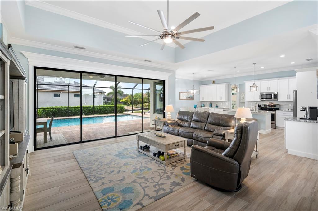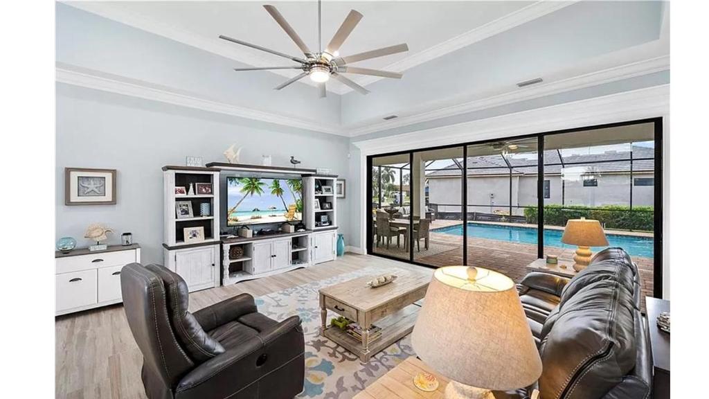 You have landed on Park Place! This gorgeous 3 bed 3 bath home has a floor plan that features the best of backyard living. A South facing crystal clear heatable pool is nestled in a large covered lanai perfect for lounging. Outside dining for 6 is en...hanced by the grilling station with sink and mini refrigerator. Beyond the pool is a private park with walking trails perfect for wildlife viewing and taking in a breath of fresh air. 2,133 sq. feet of living space features elegant wood plank porcelain flooring and perfectly appointed new décor. Each bedroom features their own en suite bathroom with the master bath featuring a large soaking tub and multi-head shower. Cozy up on the couch to stream your favorite TV shows or take off on an adventure to Sanibel, Captiva, or Pine Island or Fort Myers Beach for world class dining, boating, manatee tours and famous Florida fishing!