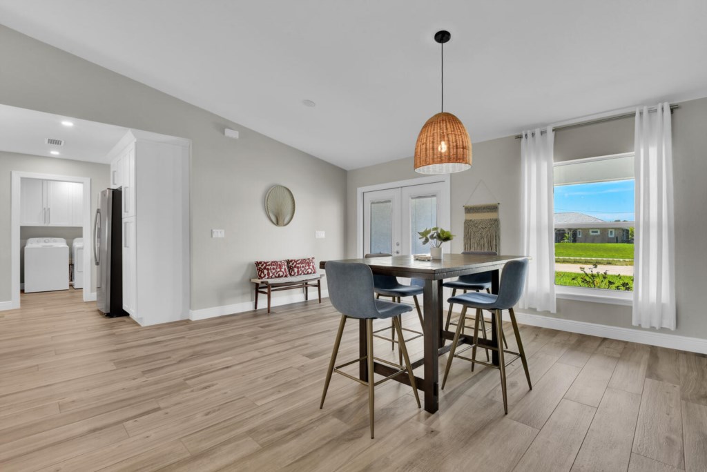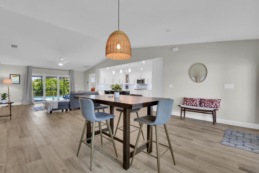 You know you have arrived in sunny Florida when you step into this gorgeous vacation villa. Contemporary construction with everything new throughout creates a clean and modern vibe. Sip an ice cold beverage while lounging on the sun shelf in the heat...able pool or dining al fresco while overlooking a fresh water canal teaming with wildlife. Catch a glimpse of the game from the lanai on the large TV screen. Three bedrooms feature a king and two queen sized beds. The master opens up to the lanai and has a double sink vanity and rain shower head. Cozy up on the couch in the spacious open concept living area with large screen TV.