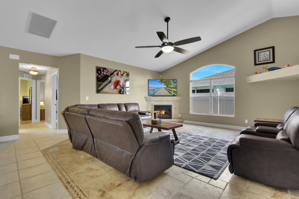 Anchors away for your perfect coastal getaway! Tuscan Treasure will have you wishing you could stay forever in your perfect Cape Coral vacation villa. This beautifully appointed luxurious home has top line amenities for the adults with a game room an...d pet friendly features for the kids and family furries! The home sits on a prime SE lake canal with access to the gulf offering spectacular sunset views and easy boating options. This 4 bedroom, 2 bath home boasts 2,423 square feet of high ceilings and remodeled bathrooms and kitchen showcasing a large island. An electric fireplace surrounded by a huge cozy sectional creates the perfect family atmosphere for chilling out in front of the large screen TV. The screened in lanai with “window view” screen panels invites you to enjoy sunsets over a lake canal teeming with wildlife. Try your luck at some lakeside fishing or simply kick back on the dock next to the chiminea fire pit. Float in the heatable saltwater pool with a rocky waterfall feature for cooling off during the day and a hot tub for warming up your nights. Fire up the grill and serve dinner poolside at your outdoor dining table while sipping a glass of Tuscan wine in the gorgeous Florida breeze. Take your pick from bikes, to kayaks, to a peddle boat to create your own outdoor adventures! Retreat into the indoor game room for hours of family fun! Challenge your friends to a game of ping pong, air hockey, or foosball or set up a basketball free throw tournament. The Pac Man machine lets you choose from a variety of Pac Man favorites for hours of arcade fun. Dine at the 6 person dining room table for an elegant meal or convert it to a poker championship table. Need a break from the action? Retreat into the master for a long soak in the tub or into a bedroom for your own private TV time. The bunk room also features a Nintendo Switch game and a pack away crib for the little ones. Located in the popular SE with a multitude of dining and shopping options. This property is more than just a home; it's a picturesque retreat that beckons you to experience lakeside living at its finest. Don't miss the opportunity to make this Floridian haven your own dream vacation home! Pool/spa heat available for $25/day; reduced monthly rate available.