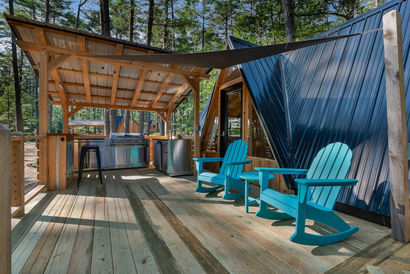 Secluded A-frame Cabin Surrounded by Trees, Close to Attractions and Ponds! Our cozy retreat comes with linens, towels, and a fully-equipped kitchen for your culinary exploits. Just bring groceries and your sense of adventure. Immerse in the tranqui...lity of Wooded Maine, with a 15-minute drive to a major grocery store. Discover nearby ponds for leisurely walks or fishing excursions. After your outdoor activities, unwind in comfort inside. Pond+Pine: A Luxurious Forest Escape A-Frame Cabin: Imagine Nestled in a serene expanse of woods, Pond+Pine is your private A-frame sanctuary. Each of our high-end cabins promises an intimate and upscale experience, despite its compact size. Premier Comfort Inside each cabin, you'll find a cozy queen bed and a pristine full bathroom. Every corner has been meticulously crafted to exude luxury and functionality. Gourmet Alfresco Dining Step outside to a fully-equipped outdoor kitchen, perfect for culinary enthusiasts. Grill your favorite steak, chill beverages in the mini-fridge, and rinse fresh produce at the sink, all while enjoying the calming whisper of the surrounding trees. Nature's Dining Room Feast with style at your personal live-edge picnic table, just a stone's throw from your cabin. Here, nature's palette of green and gold sets the mood. Relax & Rejuvenate Bask in the warm embrace of your private hot tub, or stoke a fire at your exclusive fire pit. As the night grows darker and the stars come alive, let the gentle crackling soothe your soul. Adventure at Your Doorstep Pond+Pine isn't just a retreat; it's an adventurer's playground. Cast a line into the fish-rich pond, kayak through its serene waters, canoe under the dappled sunlight, or glide on a paddle boat. We provide complimentary canoes, kayaks, and a paddleboat, so you can explore the picturesque lake at your leisure. Digital Detox In our commitment to ensuring a true escape, we've intentionally excluded Wi-Fi from our cabins. It's time to disconnect from the digital and reconnect with the natural. Nightlife Nearby For those craving a dash of thrill, a premier casino is conveniently located just 5 minutes away. From the gaming tables to gourmet dining, immerse yourself in an electrifying night out before returning to your peaceful Pond+Pine haven. Outdoor Delights Step outside onto the deck and savor your morning coffee while listening to the birds chirping. In the evenings, gather around the fire pit for marshmallow roasting and stargazing. As an added bonus, we've recently added frisbee golf, cornhole, and horseshoes to enhance your outdoor experience. Firewood is also provided as a nice little bonus, ensuring you have everything you need for a cozy and enjoyable time. Guests can enjoy common use of an outdoor pingpong table, perfect for a fun and casual activity during their stay. Reserve your stay today and experience the magic of Pond+Pine—a blend of luxury, nature, and exhilaration. While we offer 24/7 messaging, please understand that maintenance or staff availability may be limited after 5 pm or before 9 am. We aim to address your needs promptly within our staff's availability. We provide essential amenities such as coffee, soap, toilet paper, and paper towels to start your trip. Any additional extras you require will be your Don't forget, if your desired dates aren't available for this cabin, we have four more equally enchanting listings waiting for you. Simply send us a message, and we'll provide you with the links. Book your stay at our cabin oasis today and create memories that will last a lifetime. We look forward to hosting you!