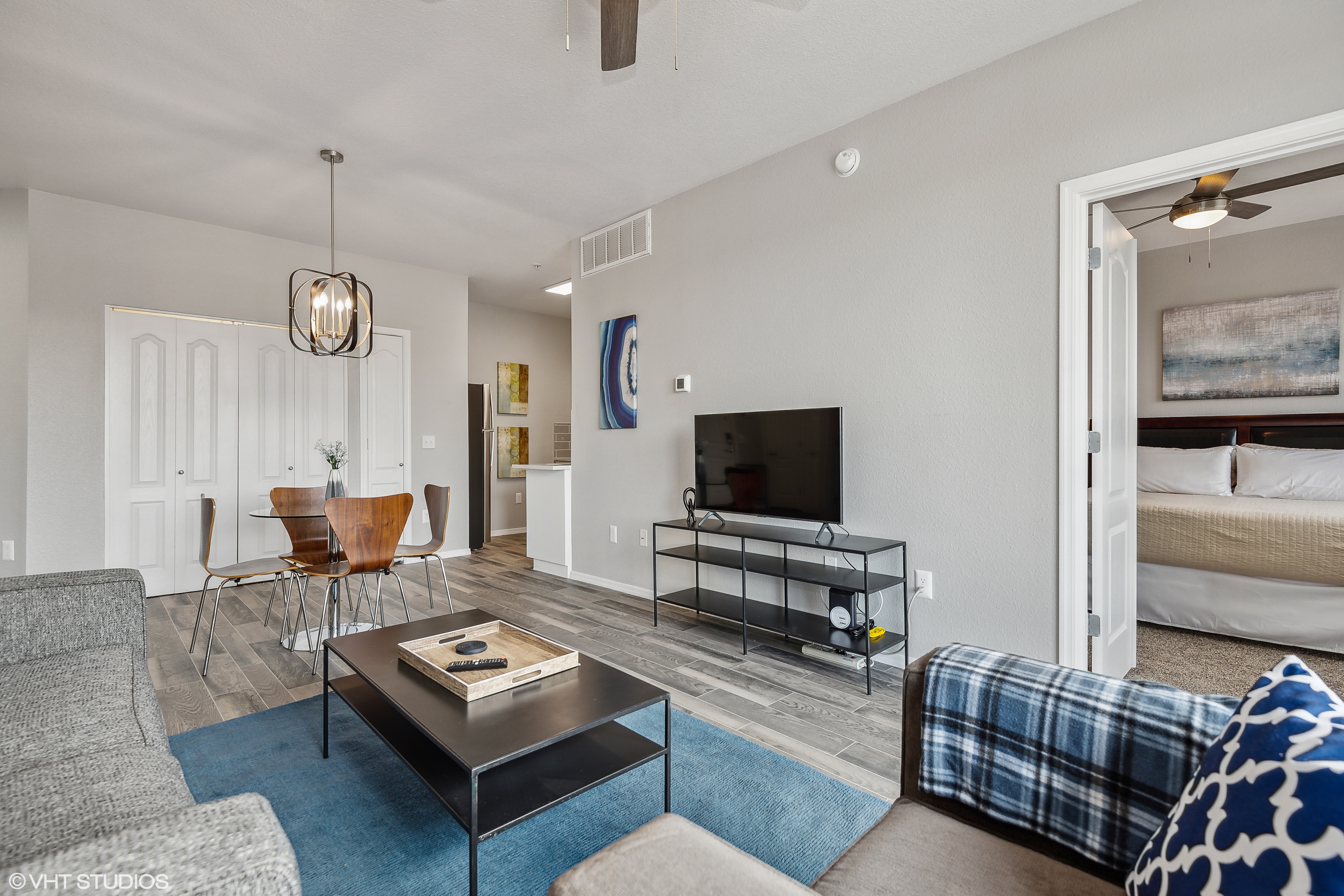 Pure Suites Furnished Housing. This luxurious apt includes granite counters, SS appliances, walk-in closet, in-unit w/d, heating/air, a king bed in the master, a queen bed in the 2nd bedroom, and you can host guests on the queen pullout sofa located ...in the living room. This building features an outdoor lounge space and grills for your use. Stay fit in the 24/7 fitness center and spin on the Peloton bikes. Stay cool in the pool and spa. Arrive with just your suitcase and we handle everything else for you. Your automated monthly payment includes all furnishings, linens, kitchen and household items, high speed wireless Internet, all utilities, access to all amenities, 24-hour maintenance and 24-hour customer service. Book today to start your Phoenix experience! 974 Square Feet Dog Breed Restrictions. Max two pets. Pets must be declared prior to arrival and pet fees paid. Apartments on 1st, 2nd and 3rd floors and accessible only by stairs on higher floors.