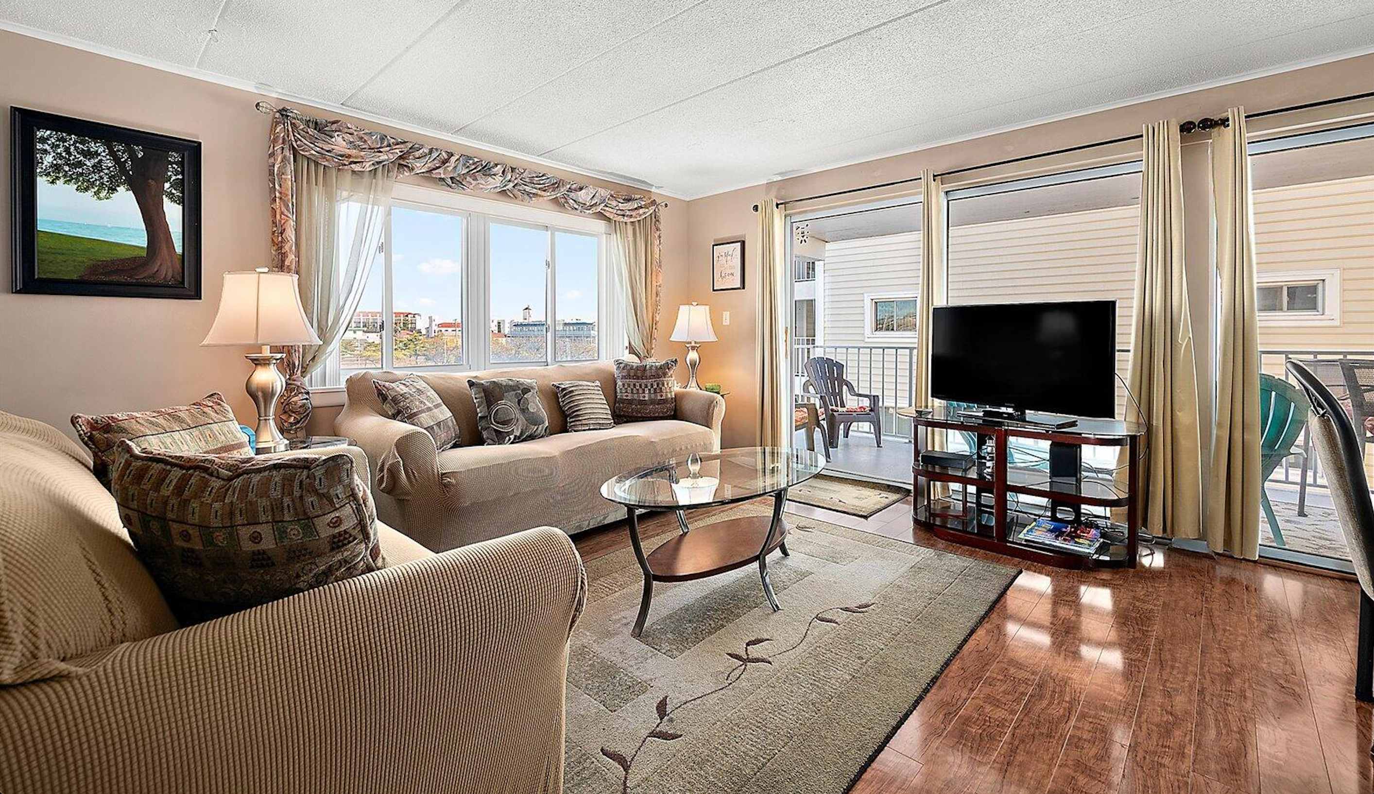 Unwind at Thunder Island 75B a bright and breezy bayside condo just steps from the Convention Center and a short walk to the beach. This spacious 2-bedroom, 2-bath getaway features an open layout, partial bay views from a private furnished balcony,... and all the essentials for a relaxed Ocean City stay. Take in beautiful sunsets, lounge by the seasonal outdoor pool, and enjoy easy access to dining, entertainment, and the boardwalk. Linens and bath towels are included with your stay. Beach short walk Convention Center across the street Boardwalk approx. 2.5 miles Bayfront sunsets balcony views Your Bayside Escape Starts Here See Full Details Below! HIGHLIGHTS 2 bedrooms; 1 King bed, 2 Twin beds 2 full bathrooms; towels included Full kitchen with island seating Private balcony with partial bay views Seasonal outdoor pool 3 Smart TVs (streaming only) Washer and dryer High-speed Wi-Fi Outdoor shower 2 parking spaces BEDROOMS Thoughtfully arranged to sleep up to 7 guests, this condo is perfect for families or small groups. Bedroom 1 Two Twin beds Living Room 7 (includes infants and children) Elevator access houseRules a $500 excessive cleaning charge may apply if the property is left in an unacceptable condition (i.e. presence of vomit or urine cleaning, etc). We kindly ask you to respect our home like it was your own! Guests under 25 must be accompanied by a parent or legal guardian for the duration of the reservation. We do NOT rent to Senior Week kids.