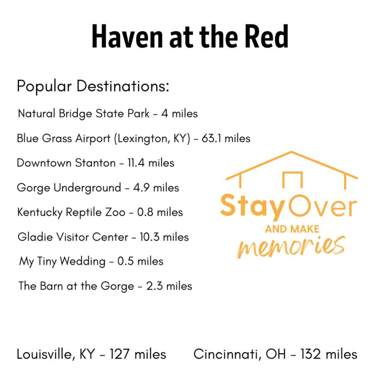 Haven at the Red is a wonderful cabin retreat snuggled amongst beautiful rock formations. This cozy A-Frame has ample windows for nature viewing and the feeling of the great outdoors. Just a couple miles from Nada Tunnel, the Red River Gorge, and the... Natural Bridge, Haven at the Red is perfect for your next Red River Gorge adventure. Beautiful decorations with large quilts, burlap, and just the right touch of "cabin" throughout make it the perfect weekend or weeklong retreat all year long. - Amenities include a fully-equipped kitchen (standard coffee maker, microwave, oven), electric fireplace, charcoal grill, hot tub, and a fire pit. Please note that signal is minimal in this area. The Satellite TV and WiFi signal may be affected and unusable during your stay. We do not guarantee these as amenities included at Haven at the Red, however you are welcome to attempt to use them. - Sleeping Arrangements: Bedroom 1: King Tempur-Pedic Bed| Bedroom 2: Queen Bed - One full bathroom - We provide fresh linens and towels. We also include essential starter packs to make your stay easier! (Starter packs include: 2 rolls of toilet paper, 2 rolls of paper towels, 3 shampoos and conditioners, 3 bar soaps, 3 trash bags, and 1 sponge.) You will also need to bring your own firewood and charcoal for the grill. Please purchase firewood locally. - Please note that a 4-wheel drive is highly recommended. The cabin is located up a steep hill and has a very steep driveway. Limited parking; vehicles exceeding 2 please park at the local park and ride and carpool to the cabin. Trailers prohibited. - Cabin is in the Natural Bridge Cabin Country Development and overlooks the Slade city/parkway area. - Prime Red River Gorge location - Close to hiking, horseback riding, rock climbing, kayaking, canoeing, zip lines, sight-seeing, restaurants, and much more. Chestnut Log Cabin Development
