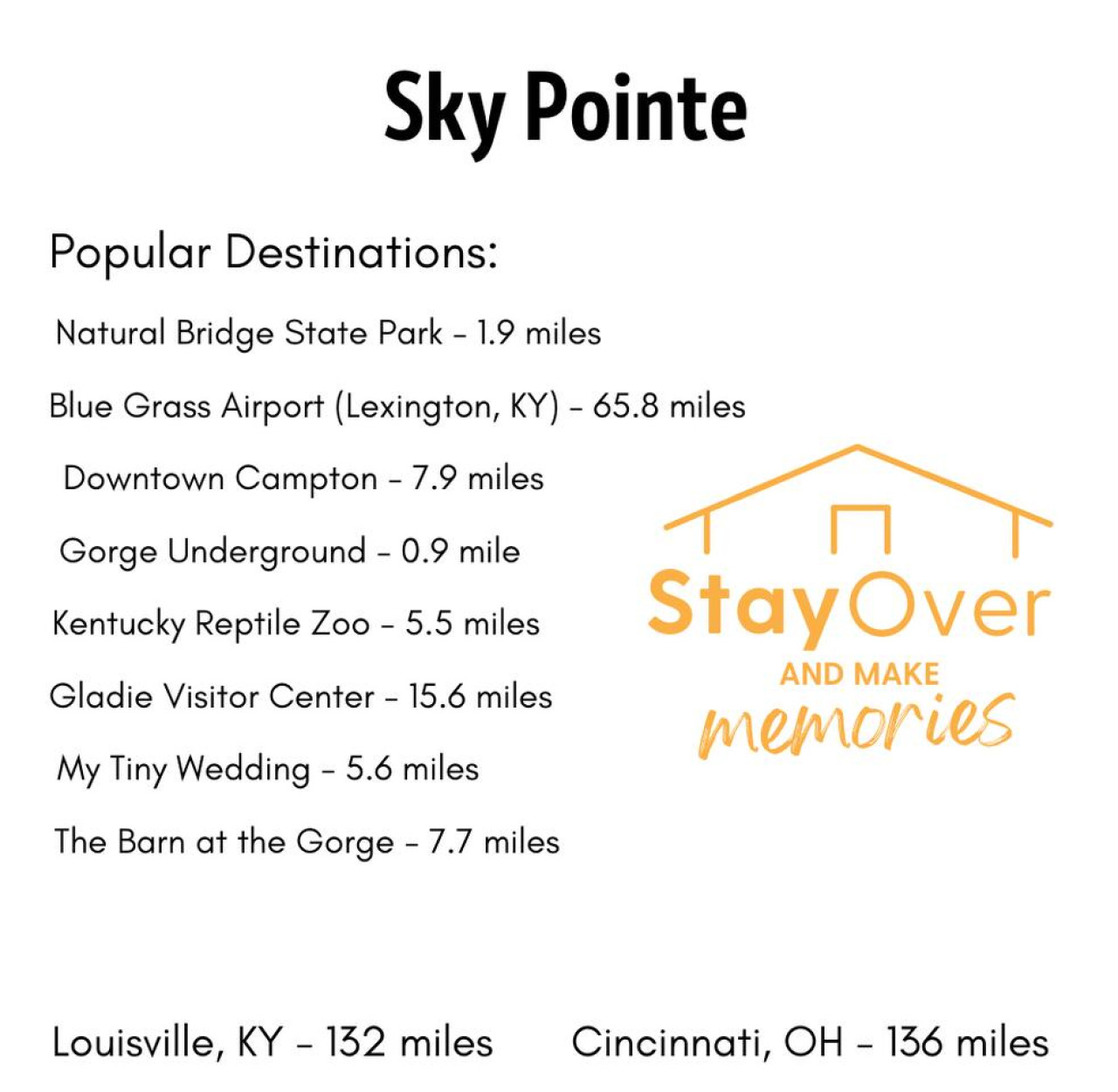 Experience million dollar views in 'Sky Pointe' cabin. This LUX cabin is 10min from Natural Bridge, located in the highly sought after Scenic Heights community, offering complete seclusion and is surrounded by forests, gorgeous cliff lines and rock f...ormations. Start bragging to your family and friends because this cabin has it all! Popular trail heads, shopping, restaurants and activities are just a short drive. Book your unforgettable Red River Gorge getaway here today! - Amenities include a fully equipped kitchen (Dual Keurig/standard coffee maker and microwave), WiFi, private hot tub, fire pit, gas grill, screened-in porch, washer/dryer, covered deck w/ outdoor furniture, and more. - Bedroom 1 Downstairs: King Bed | Bedroom 2 Upstairs: Queen Bed | Bedroom 2 Upstairs: Queen Bed - One full bathroom upstairs. One full bathroom downstairs. - Fresh linens and towels. Essential Starter Packs to make your stay easier! (Includes 2 rolls of toilet paper, 2 rolls of paper towels, 3 shampoos/3 conditioners, 3 bar soaps, 3 dishwasher pods, laundry pods, 3 trash bags, 1 sponge). Firewood not provided, please purchase locally! - Should be accessible with any vehicle! Trailers prohibited. - Secluded Red River Gorge location - Close to hiking, horseback riding, rock climbing, kayaking, canoeing, zip lines, sight-seeing, restaurants, and much more. Natural Bridge Cabin Country