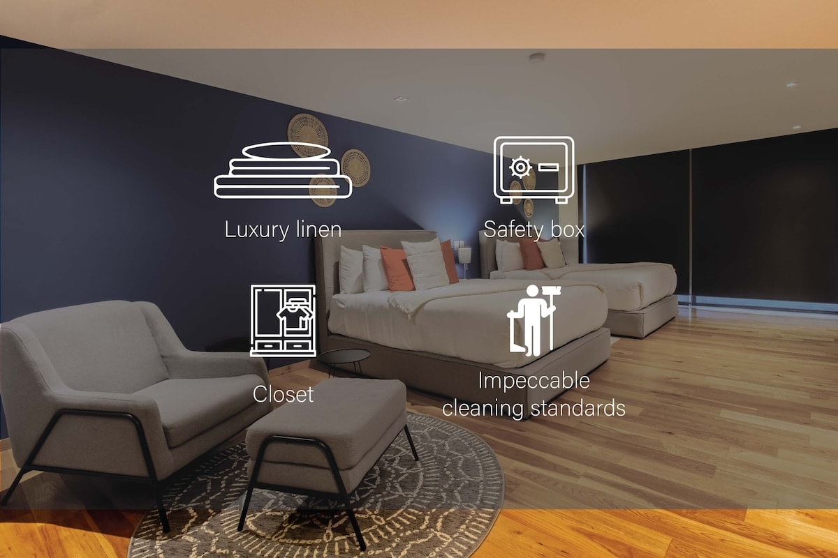 Welcome to Capitalia! It is our pleasure to host you. We hope you have an exceptional stay. If you need anything, don’t hesitate to reach out—our team is fully at your service. These are our house rules. Please follow them to ensure a comfortable experience and avoid penalties. Most importantly, enjoy your stay! Check-in is after 4:00 PM, and Check-out is at 11:00 AM sharp. Alternative times are subject to availability and may include an additional fee. Parties and loud noise are strictly prohibited at all times. Please respect your neighbors and keep noise to a minimum 24/7. Please treat our staff with respect at all times. Visitors are only permitted with a written request and prior authorization from our reservations team. If you’re using parking, your car will be inspected by staff. We are not responsible for damages, theft, or lost valuables. Do not move any furniture or appliances from their original place. Turn off lights, air conditioning, and electronics when not in use, and always close windows and lock the door when leaving. Be respectful when using common areas. Please follow building rules and treat other guests and staff kindly. Do not unplug electronic devices, as this may interfere with essential services or systems. Smoking, drugs, and firearms are strictly prohibited inside the property. Violations may result in penalties of up to $500 USD. No food or drinks on beds or sofas to avoid stains or damage to furniture. Do not flush hygiene products down the toilet. Use the designated trash bins. Please check thoroughly for personal belongings before check-out. We are not responsible for items lost or not placed in the safe. Report any damages, incidents, or maintenance issues immediately so we can address them promptly. Any damages, losses, or extra cleaning needs will be charged to your reservation. Any damage or extra cleaning required due to pets will be charged to your reservation.