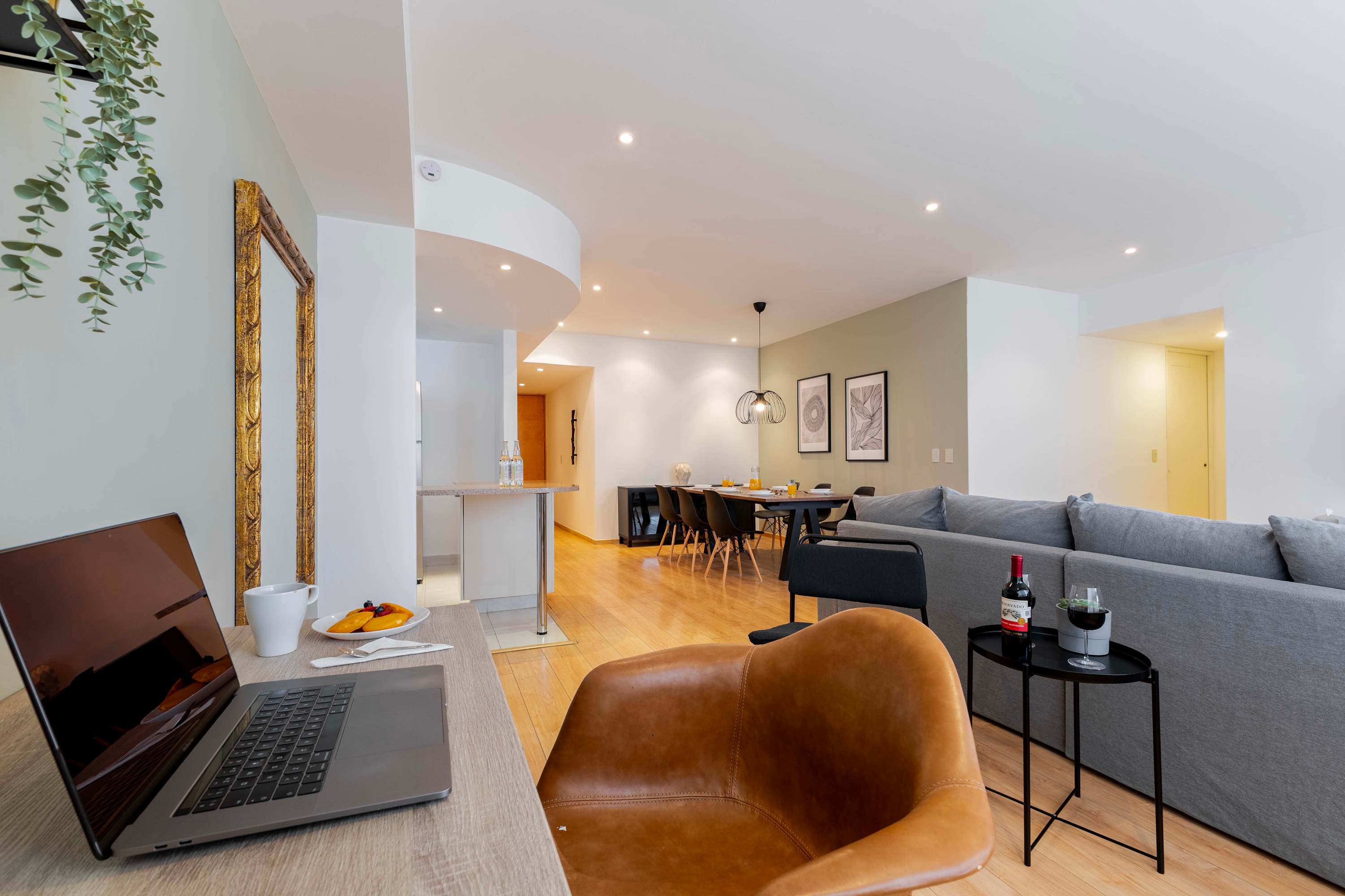 Capitalia - Magna Residencial Residential complex located in Santa Fe, with luxury amenities and a staff that will make sure your stay at Capitalia is safe, comfortable and unforgettable. Our amenities have been renovated for your confort Modern and... elegant fully furnished 2 bedroom apartment with half bath in the living area, dining area with table for 4 people, fully equipped kitchen with basic kitchen utensils, full set of dishes for 4 people, laundry area with washer and dryer, living room with screen and cable TV, desk, WIFI, master bedroom with king size bed, master bathroom with shower, linens and bathroom amenities and walk-in closet. We have a 2nd bedroom with king size bed, closet, bathroom with shower, linens and bathroom amenities. Parking and elevator, 24 hour security. access Located in Santa Fe, one of the most modern and luxurious areas of Mexico City and a city within the city, just a few minutes from the commercial and corporate area. In the surrounding area you will find fun for all ages Universidad IBERO, Tecnolgico de Monterrey, Universidad Anhuac North Campus. transit The Capitalia team will always be on the lookout for anything you need before, during and after your stay. We will be available to you by phone or message and in some cases you can find us at the Administration of the residential, as well our security staff is available 24/7 , they can support you to guide you in your doubts or requirements. notes Welcome to Capitalia Living! It is our pleasure to host you, we hope that you have a wonderful stay, if you need something please dont hesitate to ask, there is a complete team at your service. This are our rules please follow them to avoid any penalties! 1. Pets are welcome, any damage caused should be 2. Check in is after 4 PM, you can request early check in upon availability. 3. Check out is at 11 AM, you can request late check out upon availability. 4. Please double check before leaving for any belongings 5. Visitors are allowed with previous and written request. 6. If you are using parking your car will be inspected by the staff 7. The guest should provide ID and sign a contract. 8. Make sure to turn off the lights, air conditioning, and any electronics when you leave the house. Dont forget to close the windows and lock the door. 9. Report any damages and/or breakages in a reasonably timely manner. Damages exceeding the security deposit amount must be paid by guests and will be reported 10. While using common areas on the property please follow the rules. 11. Do not unplug the electronic devices 12. Do not flush hygiene products 13. No loud music or noise after 8 PM. 14. No parties allowed. 15. No Drugs allowed. 16. Smoking is prohibited inside the property 17. Firearms are prohibited
