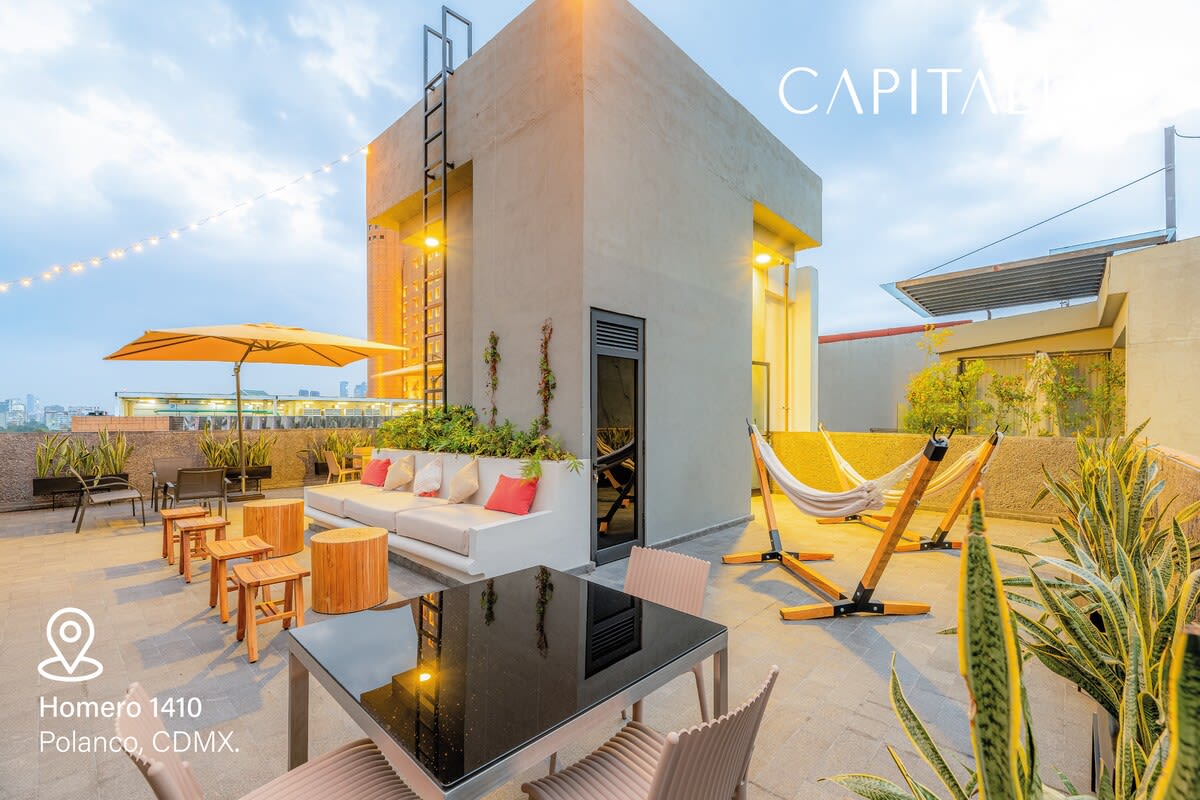 The Capitalia team will always be on the lookout for anything you need before, during and after your stay. We will be available to you by phone or message and in some cases you can find us at the Administration of the residential, as well our secur...ity staff is available 24/7, they can support you to guide you in your doubts or requirements. notes The best way to get around Mexico City is via Uber or taxi. Taxis are slightly more expensive, but they are a hassle-free means of getting around. Uber is a safe and more affordable way to navigate the city. You can drive yourself but be aware there is a lot of traffic and you need to be patient. Taxi or Uber Phone ahead for a taxi de sitio (safe taxi) to ensure that you get official and safe transportation around the city. Most hotels and restaurants are happy to call one of the official cars for you, or you could wait at the ""Sitio"" signs and stands located around town. Flagging one down on the street could leave you in the potentially precarious situation of hopping in the back of an unofficial taxi and a driver with maybe questionable intentions. Additionally, Uber operates in Mexico City and is an affordable and safe way to navigate the metropolis. Tourist Bus The red double-decker Turibus provides commentary (available in eight languages) on various popular sights and routes throughout the city. Tours usually last around three hours with approximately 20 stops along the way. For those looking to pack in lots of sightseeing in one day, it's an affordable option (costing about $8 for adults). It runs daily from 9 a.m. to 9 p.m. Car The streets are congested, the routes are baffling, parking is scarce and expensive, plus the rules of the road are hard to understand (particularly since drivers rarely follow them). In some areas, there's also a danger of auto theft. If you do decide to drive, several car rental companies operate out of the Mexico City airport and in several parts of the city. neighborhood Enjoy the convenience of a Rooftop Terrace, Business Center, Laundry Room, 24/7 Security, Lobby, Elevator and High Speed Internet. space Discover a refined lifestyle where sophistication meets convenience. Step into luxurious interiors, enjoy fully equipped kitchens, or relax on your balcony. Stay comfortable with individual air conditioning, ensuring the perfect ambiance in every season. Unwind and socialize on our rooftop terrace, a serene retreat above the bustling city. Simplify daily tasks with our onsite laundry room and stay connected with our business center. Experience luxury at Homero 1410, Polanco's urban haven. houseRules 00 PM, and Check-out is at 11