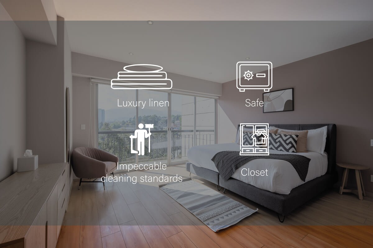 Capitalia - Magna Residencial Residential complex located in Santa Fe, with luxury amenities and a staff that will make sure your stay at Capitalia is safe, comfortable and unforgettable. Our amenities have been renovated for your confort Modern and... elegant fully furnished 2 bedroom apartment with half bath in the living area, dining area with table for 4 people, fully equipped kitchen with basic kitchen utensils, full set of dishes for 4 people, laundry area with washer and dryer, living room with screen and cable TV, desk, WIFI, master bedroom with king size bed, master bathroom with shower, linens and bathroom amenities and walk-in closet. We have a 2nd bedroom with king size bed, closet, bathroom with shower, linens and bathroom amenities. Parking and elevator, 24 hour security. access Located in Santa Fe, one of the most modern and luxurious areas of Mexico City and a city within the city, just a few minutes from the commercial and corporate area. In the surrounding area you will find fun for all ages Universidad IBERO, Tecnolgico de Monterrey, Universidad Anhuac North Campus. transit The Capitalia team will always be on the lookout for anything you need before, during and after your stay. We will be available to you by phone or message and in some cases you can find us at the Administration of the residential, as well our security staff is available 24/7, they can support you to guide you in your doubts or requirements. notes