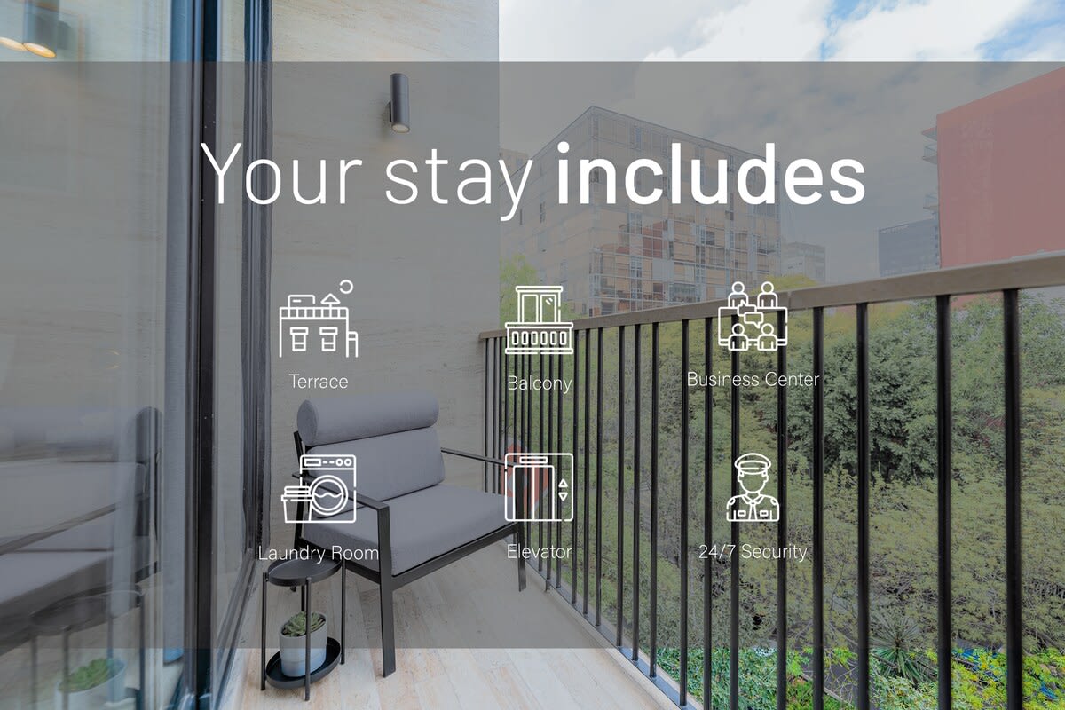 The assigned unit may have some differences in views or decor compared to the photos, as the listing represents the entire category of apartments, not a specific unit. Rest assured, all our units come equipped with the same high-quality amenities an...d services to ensure your comfort. You will be in one of the biggest cities in the world, it can get hectic and messy. We do our best to provide a calm and peaceful stay, however, please consider there may be noise coming from outside. transit Nreghborhood Enjoy the convenience of a Rooftop Terrace, Business Center, Laundry Room, 24/7 Security, Lobby, Elevator and High Speed Internet. space Discover a refined lifestyle where sophistication meets convenience. Step into luxurious interiors, enjoy fully equipped kitchens, or relax on your balcony. Stay comfortable with individual air conditioning, ensuring the perfect ambiance in every season. Unwind and socialize on our rooftop terrace, a serene retreat above the bustling city. Simplify daily tasks with our onsite laundry room and stay connected with our business center. Experience luxury at Homero 1410, Polanco's urban haven. interactionWithGuests