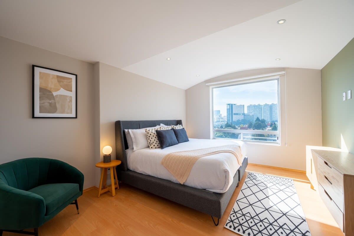Capitalia - Magna Residencial Residential complex located in Santa Fe, with luxury amenities and a staff that will make sure your stay at Capitalia is safe, comfortable and unforgettable. Our amenities have been renovated for your confort Modern and... elegant fully furnished 2 bedroom apartment with half bath in the living area, dining area with table for 4 people, fully equipped kitchen with basic kitchen utensils, full set of dishes for 4 people, laundry area with washer and dryer, living room with screen and cable TV, desk, WIFI, master bedroom with king size bed, master bathroom with shower, linens and bathroom amenities and walk-in closet. We have a 2nd bedroom with king size bed, closet, bathroom with shower, linens and bathroom amenities. Parking and elevator, 24 hour security. access Located in Santa Fe, one of the most modern and luxurious areas of Mexico City and a city within the city, just a few minutes from the commercial and corporate area. In the surrounding area you will find fun for all ages Universidad IBERO, Tecnolgico de Monterrey, Universidad Anhuac North Campus. transit The Capitalia team will always be on the lookout for anything you need before, during and after your stay. We will be available to you by phone or message and in some cases you can find us at the Administration of the residential, as well our security staff is available 24/7, they can support you to guide you in your doubts or requirements. notes