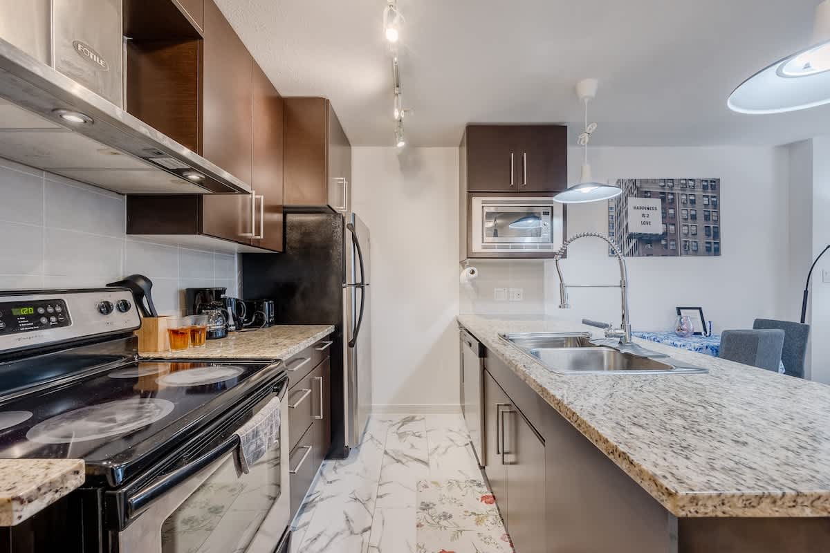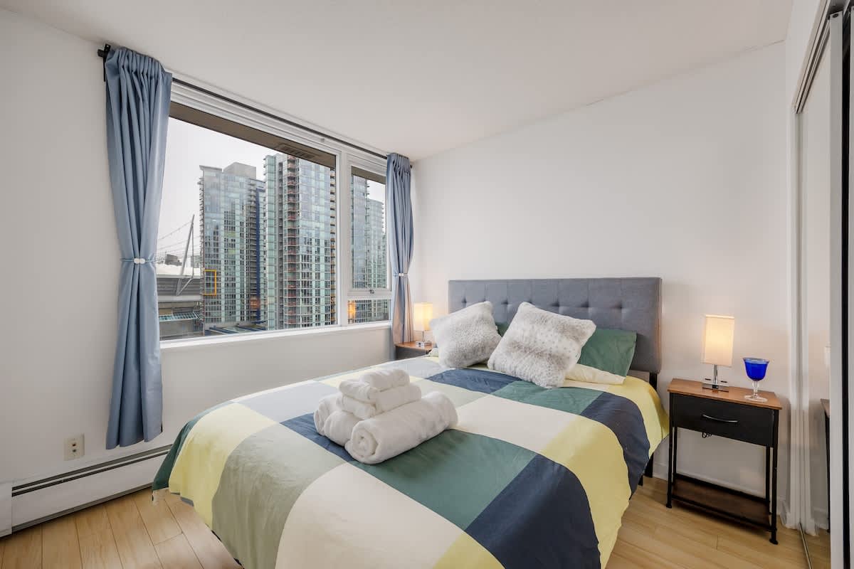 Experience Vancouver in style! - Modern condominium with open-concept living area - Stunning city views and relaxing atmosphere - Well-equipped kitchen with modern appliances - Access to gym, hot tub, and sauna - Two comfortable bedrooms, ...including a queen-sized bed - Nearby attractions include Stanley Park and Granville Island A comfortable stay awaits! space - Two bedrooms provide comfortable sleeping arrangements - Master bedroom features a queen-sized bed - Den offers a single bed for flexibility Interior Feeling - Relaxing hot tub available for use - Access to building amenities such as a gym and sauna Delightful Dining - Space is maintained with high cleaning standards Nearby Attractions A magnificent urban park with lush greenery and scenic views. - Granville Island Experience breathtaking views and thrilling adventures. - Gastown A cultural cornerstone featuring an extensive collection of art. A comfortable stay awaits! access Step outside and immerse yourself in the vibrant heart of Vancouver! This condo is perfectly situated next to Rogers Arena, placing you steps away from exciting events and entertainment. Explore the surrounding area, filled with a diverse array of dining options to satisfy every palate. From casual eateries to upscale restaurants, you'll find something to suit your mood. Sports fans will love the proximity to BC Place Stadium, just a short walk away. For shopping enthusiasts, a variety of boutiques and stores are within easy reach. Experience the unique charm of this downtown neighborhood, where the energy of the city meets the comfort of your stylish retreat. interactionWithGuests Getting around Vancouver from our stylish condo is a breeze! You'll find convenient public transportation options nearby. The Stadium-Chinatown SkyTrain station is just a short walk away, providing easy access to the entire city and beyond, including direct lines to Vancouver International Airport (YVR). Numerous bus routes also operate in the area, offering frequent service to various destinations. For those driving, paid parking is available in the building's garage, ensuring secure and convenient parking for your vehicle. Travel times Please note00 PM and check-out is at 10