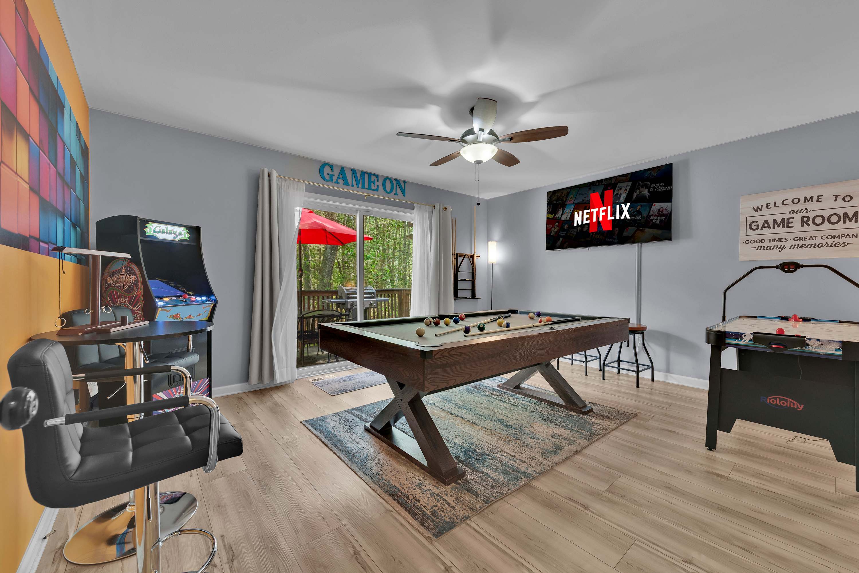 Escape to The Hideout @ Arrowhead Lake! Enjoy a 7-person hot tub, firepit, BBQ, pool table, arcade, air hockey and more. With a stocked kitchen, deck and game room, it's perfect for families or a relaxing getaway. Located in an amenity-rich resort w...ith lakes, pools, beaches, sports courts, playgrounds and year-round activities. Unwind, play and make lasting memories! space 10 miles Pocono Raceway 12 miles Mount Airy Casino Resort 15 miles The Crossing Premium Outlets 20 miles Lehigh Gorge State Park Inside, youll find an open-concept kitchen and living space with a large dining area and a cozy living room featuring a gas fireplace. Step out onto the outdoor deck to grill or enjoy morning coffee with serene views. The game room is perfect for entertainment with a pool table, arcade games, and comfortable seating. ENTERTAINMENT and AMENITIES The home is equipped with 3 WiFi-connected Smart TVs, blazing fast 250+ Mgbs WiFi, and a game room featuring a pool table and a classic arcade machine. We provide a drip coffee maker, a Keurig coffee maker, an outdoor grill, and all the essentials for a comfortable stay. We aim to provide an impeccably functioning home that is superbly clean with everything you should need to unwind and relax. BEDROOM LAYOUT Bedroom 1 (Main Floor) 2 Double Beds Bedroom #3 (Main Floor) Temporary membership fees are mandatory and is assessed to all rentals for guests age 6 and up. These fees are collected by owner and paid to the HOA. **NOT INCLUDED IN YOUR STAY** **In Season = Memorial Day to Labor Day** Overnight Guests and Day Guests (In-Season) $2.00 per person per day Vehicle Gate Card Fee $20 Registration and payment must be completed at least 3 days prior to arrival. Late registrations (less than 3 days before arrival) are subject to a $100 late fee. Please check the community website (Arrowhead Lake PA) for information pertaining to pool schedules, community events and other helpful info. Upon arrival all guests are required to complete a registration form for security and emergency purposes as our property is situated in a private gated community. The guest registration form will request the full names and ages of each guest in your party, as well as vehicle and driver information, including the license ID number of the main registrant and the plate numbers for each vehicle entering the community. Please ensure that the names on the submitted forms match the legal ID of the person driving. HOUSE RULES Please keep noise levels reasonable, especially outdoors. We want to maintain a serene environment for all guests and respect our neighbors. Minimum age requirement is 25 years old for non-family groups. Maximum of 10 guests. Parking limited to 4 cars; no RVs or trailers. Rental agreements required for stay. Gated community will only allow entry with PRINTED vehicle registration and valid driver's license. No digital versions or photocopies. No pets allowed We aim to set the standard for short-term rental experiences. We will proactively notify you when early check-in and/or late check-out are possible. access interactionWithGuests notes Rental Agreement and HOA agreement required to be agreed to and signed before the stay. They will be sent post booking.