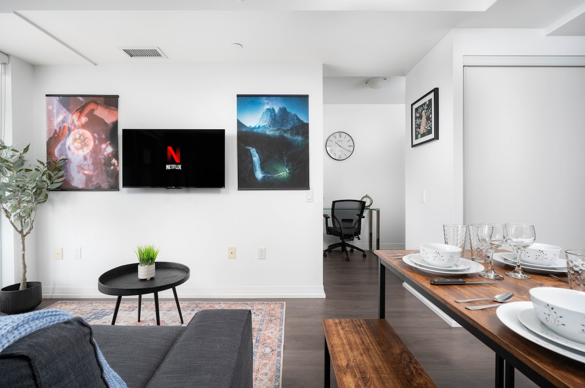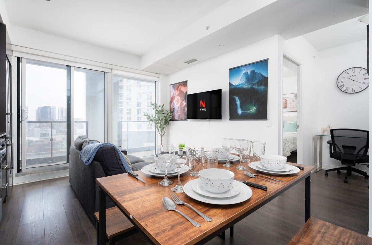 Welcome to our cozy 2-bedroom condo, perfectly located just minutes from the Eaton Centre in Toronto. Enjoy modern amenities, stylish decor, and a comfortable space ideal for relaxation after a day of exploring the city. With convenient access to sh...opping, dining, and entertainment, this is the perfect home base for your Toronto adventure! Walk to 2 Bedrooms 3 beds (Trundle style) 1 Bathroom Fully stocked kitchen for meals WIFI In Unit Washer/Dryer Steps to Eaton Centre houseRules