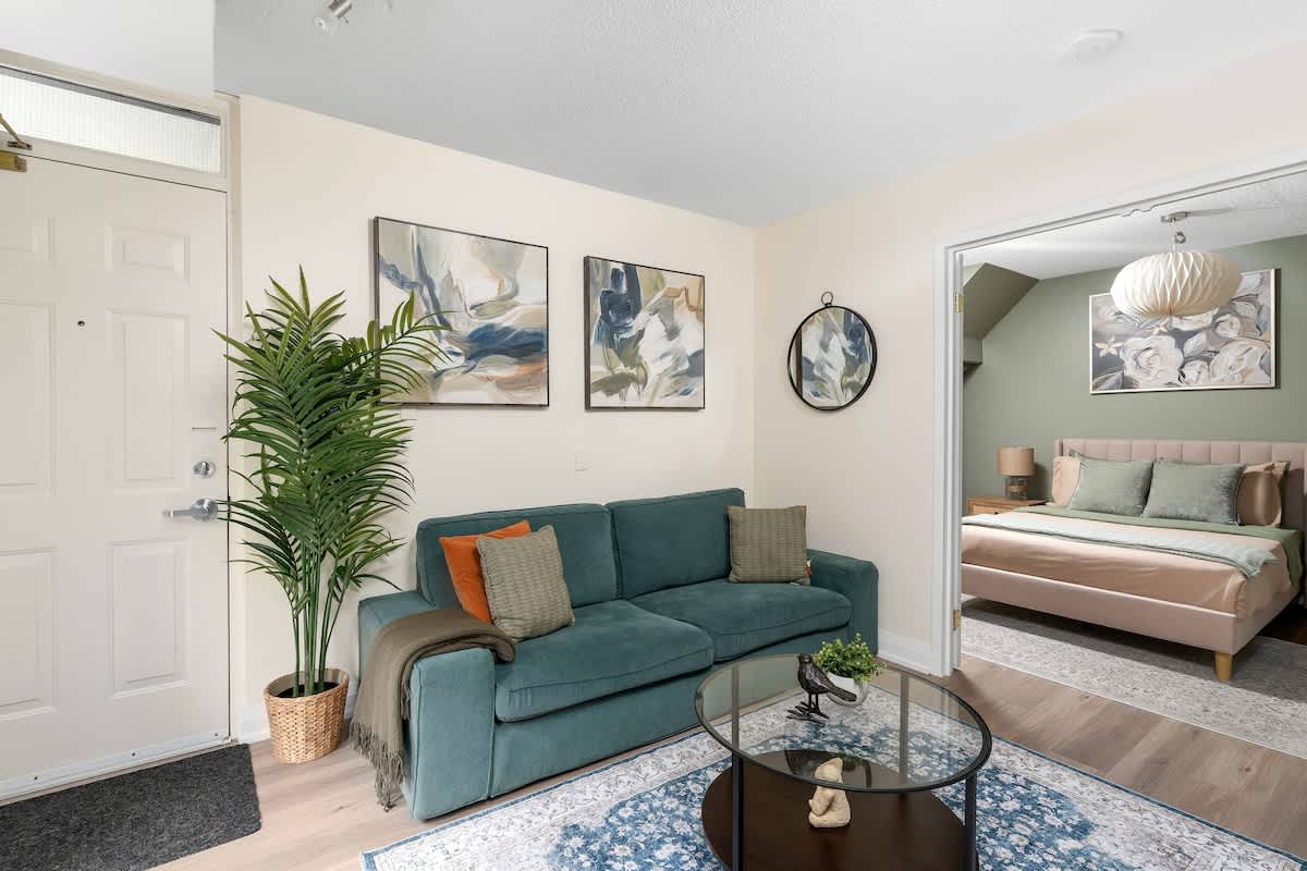 Enjoy a cozy and spacious townhome in the vibrant Liberty Village, just a short walk from Lake Ontario. Perfect for a long or short stays, my space offers Stroll to the waterfront, cafes and restaurants, a spacious living room, fully equipped kitche...n, and cozy bedroom. Amenities No smoking in the unit, if smoking is to be found $350 remediation charge will occur Lost Keys and Fob ($250 replacement fee) Absolutely no parties or more than 2 guests in the space. If an illegal party is to be found, all guests will be removed with no refund and police will be called. The neighbours have also been instructed to call police for illegal parties. Please no shoes in the house Late Check out will be charged for a fee. If you need to check in early or stay late please let us know before hand so we can make arrangements. Stained Linens with Alcohol, wine or food will be charged at $30-$50 per item. space neighborhood transit