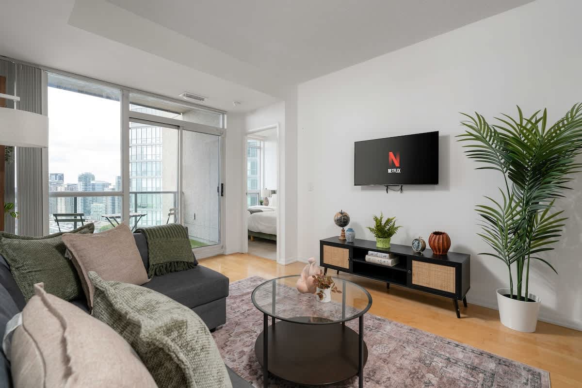 Bright 1-bedroom apartment offers two comfy twin beds with thick mattresses and a sofa bed, perfect for small groups or families. Located just steps from BMO Field, Fort York, and Torontos waterfront, youll be right in the heart of the action. Enjo...y a fully equipped kitchen, high-speed Wi-Fi, in-suite laundry, and a private balcony to relax after a day of exploring. Whether youre here for a game, a concert, or a weekend getaway, my space offers comfort and convenience youre looking for! space Entire unit (No building amenities) houseRules interactionWithGuests notes