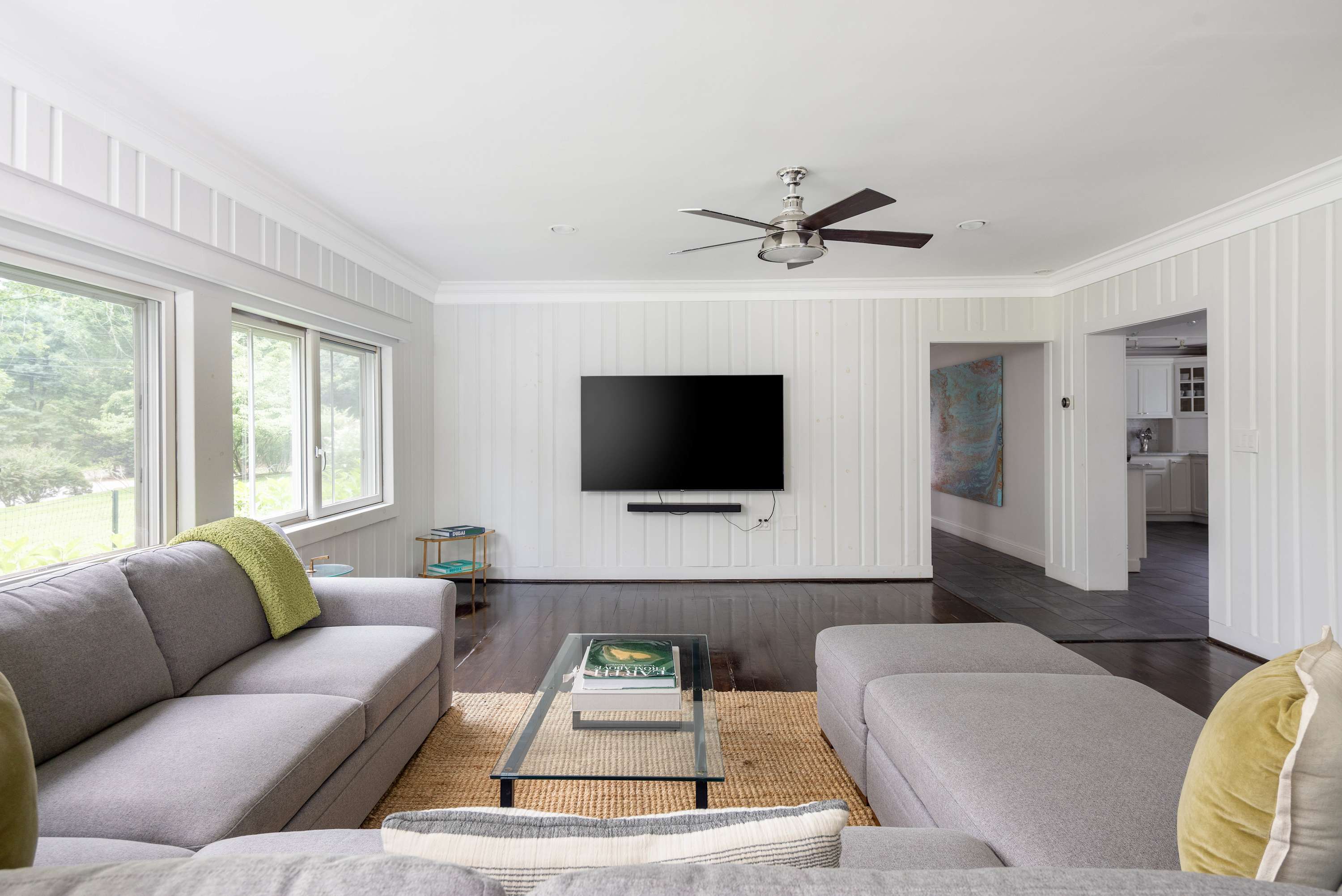 A detached two car garage provides ample storage for paddle boards, kayaks, and surfboards. With grandfathered clearing and surrounded by acres of nature preserve, this residence is a serene and spacious East Hampton escape just minutes from the best of the Hamptons.
