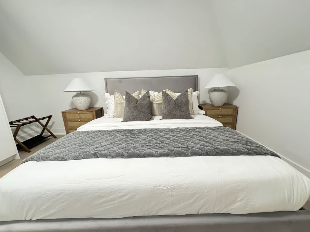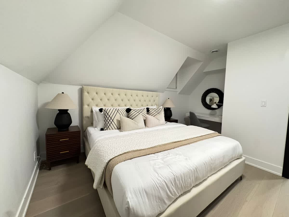 Experience elevated city living in this beautifully designed and spacious apartment, offering comfort, style, and functionality in one inviting space. With two luxurious king bedrooms, a sofa bed, and a dedicated work area, this home is ideal for co...uples, families, or groups seeking a refined and relaxing stay in Toronto. space neighborhood transit We provide 1 designated parking spot, at the back of our home.