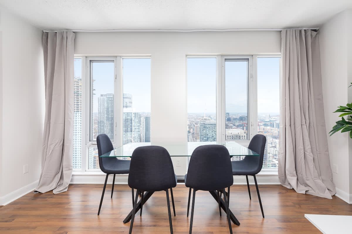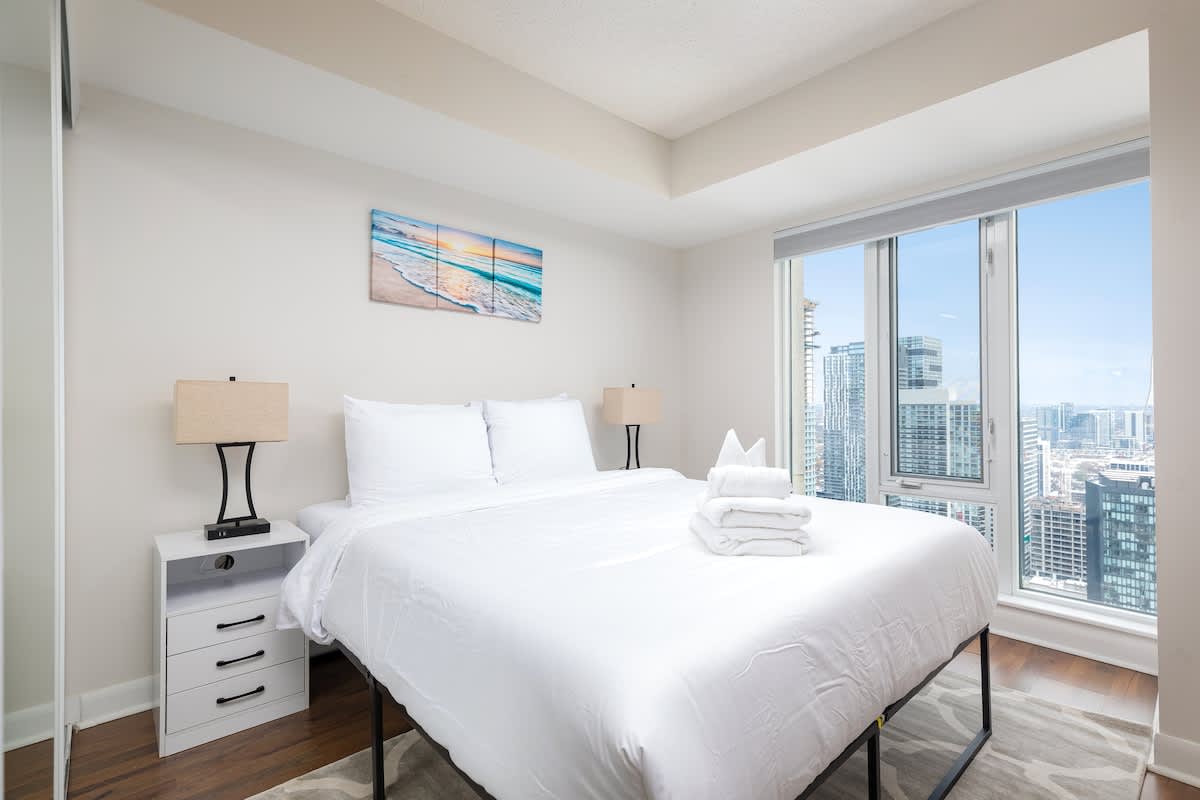 Experience Toronto from this spacious 2-bedroom, 2-bathroom condo in the vibrant CityPlace neighborhood. Perfectly suited for groups of up to 7, the suite features a King bed, a Queen bed, and versatile sleeping arrangements in the common area. Enjo...y a 55-inch TV, a fully stocked kitchen, and the rare benefit of a free parking spot. Situated steps from the waterfront, CN Tower, and major transit, this modern residence is the perfect home base for your urban adventure. houseRules This thoughtfully curated urban suite offers a blend of luxury and practical living, designed to accommodate larger groups without sacrificing comfort. The primary bedroom serves as a true retreat, featuring a massive King-sized bed with premium linens and an ensuite bathroom for added privacy. The second bedroom is elegantly furnished with a plush Queen-sized bed. To accommodate a total of 7 guests, the living area provides additional flexible sleeping space, ensuring everyone has a comfortable place to rest. The open-concept heart of the home features a sleek living room centered around a 55-inch TV, perfect for movie nights after a day of sightseeing. Culinary enthusiasts will love the fully stocked kitchen, complete with modern appliances, cookware, and plenty of counter space for preparing group meals. While this unit does not feature a balcony, the expansive floor-to-ceiling windows offer a bright, temperature-controlled environment with views of the surrounding architectural landscape. With two full bathrooms, your group can enjoy a streamlined morning routine before heading out to explore the city. access You are located in the heart of CityPlace, one of Torontos most dynamic and modern downtown communities. The building is situated directly across from the iconic Canoe Landing Park, an eight-acre green space featuring unique Canadian art, sports fields, and plenty of space for a morning stroll. You are perfectly positioned between the energy of the Entertainment District and the natural beauty of the Lake Ontario waterfront. A short walk in any direction leads you to the citys top attractions. You can reach the CN Tower, Rogers Centre, and Ripleys Aquarium in under ten minutes. The area is also a hub for food and culture, with local breweries, trendy cafes, and a wide variety of international restaurants just around the corner. For essentials, there are several large supermarkets and pharmacies within a five-minute walk, making this one of the most convenient locations for a long or short stay. interactionWithGuests Transportation is seamless from this central hub. This unit includes the highly sought-after perk of a free underground parking spot, allowing you to bypass the high costs and stress of downtown parking. For those using public transit, the Bathurst and Spadina streetcar lines are just steps away, providing frequent, direct access to Union Station and the citys subway network. If you are flying in, Billy Bishop Toronto City Airport is exceptionally close, reachable by a short drive or a pleasant walk through the waterfront district. For international travelers, the UP Express at Union Station offers a direct 25-minute train ride to Pearson International Airport. The neighborhood is also incredibly walkable and bike-friendly, with dedicated paths like the Martin Goodman Trail nearby, connecting you to the best of Torontos lakefront and downtown core. notes