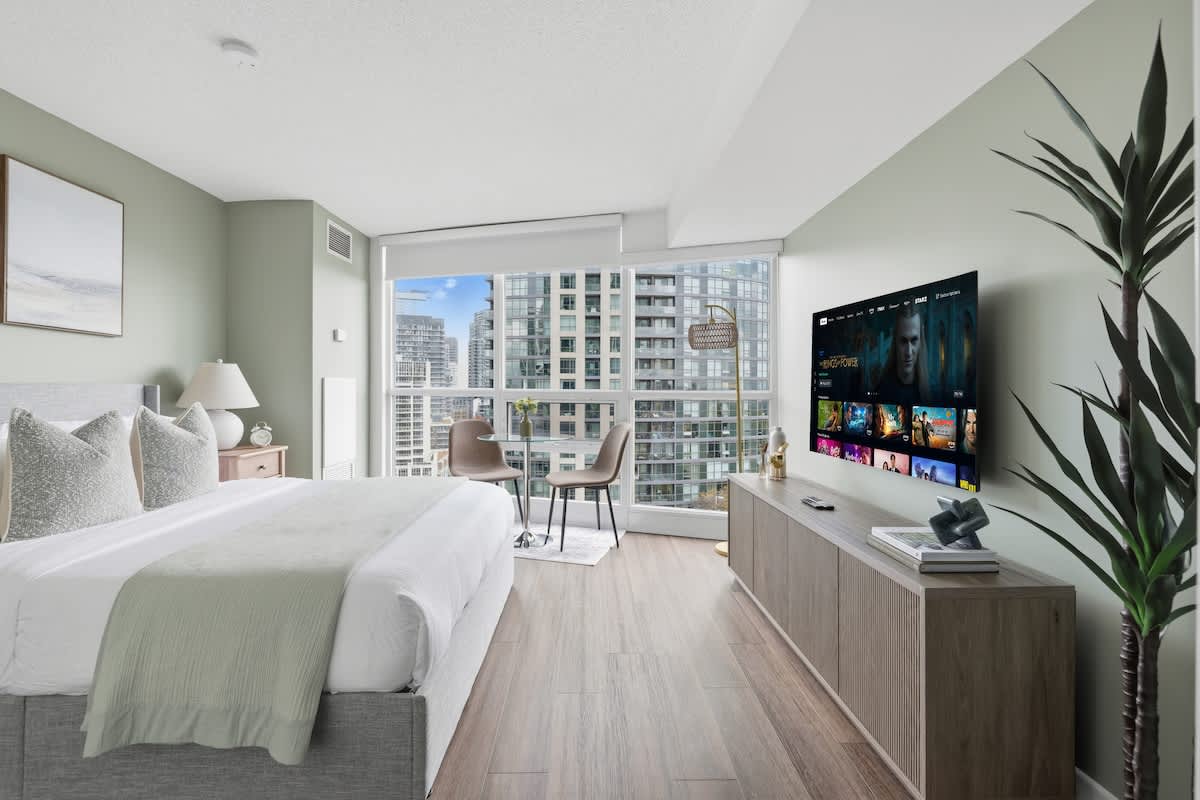 A bright and modern studio in Fort York perfect for two guests. Features a queen bed, a 55-inch TV, fully stocked kitchen, and stylish finishes. No patio and no free parking, but transit and attractions are steps away. Ideal for couples, solo travel...ers, or business trips. space The guest will have access to the entire unit as well as any amenities provided. Please, make yourself at home. interactionWithGuests Set within the dynamic Fort York community, the area blends history with modern city living. Guests can explore waterfront parks, historic sites, local cafs, and essential shops just a short walk away. The neighborhood is known for its convenience, welcoming atmosphere, and proximity to downtown attractions without being in the middle of the noise. transit *********************Parking********************* There is no parking spot included in this property. houseRules