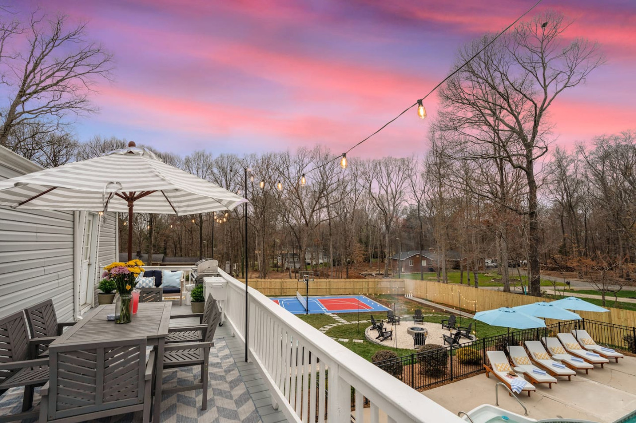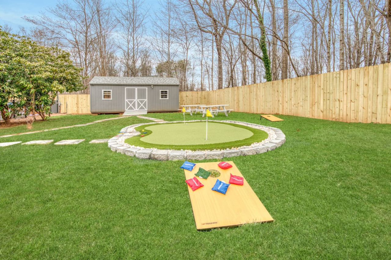 LUXURY! Vacation dream with our luxurious oasis for families! Boasting unique amenities like golf putting greens, hot tub, balcony, deck, pickleball court, two basketball goals, and outdoor bowling alley, this home is a paradise for leisure and sport...s enthusiasts alike. Accommodate 10 adults and 6 kids, with 11 beds. 18 min to NCAA & ACC Tournaments' Greensboro Coliseum 18 min to PGA Tour Sedgefield Country Club Golf Course 28 min to High Point Furniture Market Discover Unmatched Luxury Here! **NO PARTIES, GATHERINGS, OR EVENTS** *NO CHIPPING GOLF BALLS* *NO OUTDOOR MUSIC* ☆☆ PLEASE READ HOUSE RULES BEFORE BOOKING IN THE HOUSE RULES SECTION (NOT HERE)☆☆ KEY FEATURES: ☀ 5 beautiful bedrooms; 1 king, 2 queen, 2 full beds, & 6 twin beds (2 twin-over-twin bunk beds with trundle beds) ☀ 3.5 bathrooms, including a master ensuite ☀ Modern kitchen with new, stainless steel appliances ☀ Open living room with lots of comfy seating & smart TVs ☀ Dining within kitchen room seating to comfortably accommodate 10 (plus countertop seating & outdoor dining) ☀ STUNNING backyard with TONS of amenities; golf putting greens, pickleball court, outdoor bowling alley, pool, hot tub, fire pit, pool table, ping pong, BBQ grill, corn hole, & more! Here Are A Few Kind Words From Our Past Guests: "Absolutely loved our stay! Waking up to the serene glow of sunlight filtering in made each morning memorable. There are so many amenities that it was like an amusement park! Looking forward to our next stay!" - Olivia "Jordan was an outstanding host, offering prompt replies and helpful tips. The property itself is stunning, melding comfort with style, all while being conveniently near downtown Greensboro. Highly recommend for a memorable stay." - Sophia "I was charmed by this place from the moment we arrived, finding it exactly as depicted! Impeccably clean with a host that sets the bar for excellence. It's a definite must-return for me!" - Ava **NO PARTIES, GATHERINGS, OR EVENTS** *NO CHIPPING GOLF BALLS* *NO OUTDOOR MUSIC* ☆☆ PLEASE READ HOUSE RULES BEFORE BOOKING IN THE HOUSE RULES SECTION (NOT HERE)☆☆ ☆☆ BEDROOMS ☆☆ In this home, you'll find five bedrooms. The master bedroom is on the upper level, with two full beds, smart TV, and private ensuite bathroom. Right across the hall are four more bedrooms, with a king, queen, queen, and full bed accordingly. On the main level, there are two bedrooms located right off the kitchen & the rest of the entertainment area. Between the two bedrooms share a full bathroom. On the lower level den, there is an additional bedroom. This room has a pool table, ping pong table conversion kit, and arcade games. Plus it is filled with two twin-over-twin bunk beds and two trundle beds (total of 6 beds), swivel chairs, and lots of games, including board games! ☆☆ BATHROOMS ☆☆ There are three bathrooms spread out across this home, all of which have been completely renovated. The master ensuite has two sinks, a toilet, and shower only with a seat inside. The hallway bathroom right off of the other four second floor bedrooms is equipped with a sink, a toilet, and a shower/tub combo. On the lower level den, there is a full bathroom right off of the main entertaining area with a sink, toilet, and shower/tub combo. On the main floor, there is a half bath connected to the kitchen room. ☆☆ KITCHEN & DINING ☆☆ The modern, open kitchen is located right off of the main living areas, and is loaded with all new stainless steel appliances & a coffee station (including a Keurig & coffee pods). Bright, open, and beautifully designed, this is a chef's kitchen made for entertaining! The dining room is right next to the kitchen, with enough seating to comfortably fit 6 people (plus additional seating in the kitchen for 4 more) with lots of natural light, looking over all the amazing amenities in the backyard, just steps away! ☆☆ LIVING ROOM ☆☆ The main living room is on the main level, attached to the kitchen & dining areas. Lots of comfy seating on an oversized sectional, a large smart TV, and a separate seating area tucked away next to the main living area, with some additional seating & tabletop games to enjoy! ☆☆ OUTDOOR SPACE ☆☆ The main attraction of this home - WOW! This yard is HUGE and has everything you and your family/friends could ask for: ☀ Pool (unavailable September-May) ☀ Hot tub ☀ Golf Putting Greens ☀ Pickleball Court ☀ Basketball Court ☀ Fire pit (wood-burning) ☀ Corn Hole ☀ Sunbathing chairs ☀ Outdoor lounge seating ☀ Outdoor dining tables ☀ BBQ grill There is so much to do here, that all of your friends & family will be thoroughly entertained throughout your entire stay. No matter the season, this resort-style backyard has it all. Book your stay with us today and you will NOT be disappointed. Get ready for a vacation you will never forget! ★☆ Book Now & Let Us Take Care Of You In Greensboro! ☆★ ☆☆ PLEASE READ HOUSE RULES BEFORE BOOKING IN THE HOUSE RULES SECTION (NOT HERE)☆☆ **NO PARTIES, GATHERINGS, OR EVENTS** Local Property Manager: Blake This property includes security features, such as Schlage smart locks and Ring floodlight cameras, and noise decibel detectors for your safety and peace of mind. We are pet-friendly! Pet Fee is $150, max of 2, under 50 lbs each. Pool is not heated. Although it remains uncovered throughout the year, the pool is not available for use from September to May; however, the hot tub will be operational during those months. We'd like to set your expectations that the pool temperature will continue to be determined by the weather temperature, as this is a major contributing factor. PARKING: - ALL cars must park in the driveway which has a maximum of FOUR (4) cars - Do NOT park on the street in from our direct neighbors. The neighbors will TOW you. - Do NOT park on the street directly in front of the driveway **NO PARTIES, GATHERINGS, OR EVENTS** ☆☆ PLEA