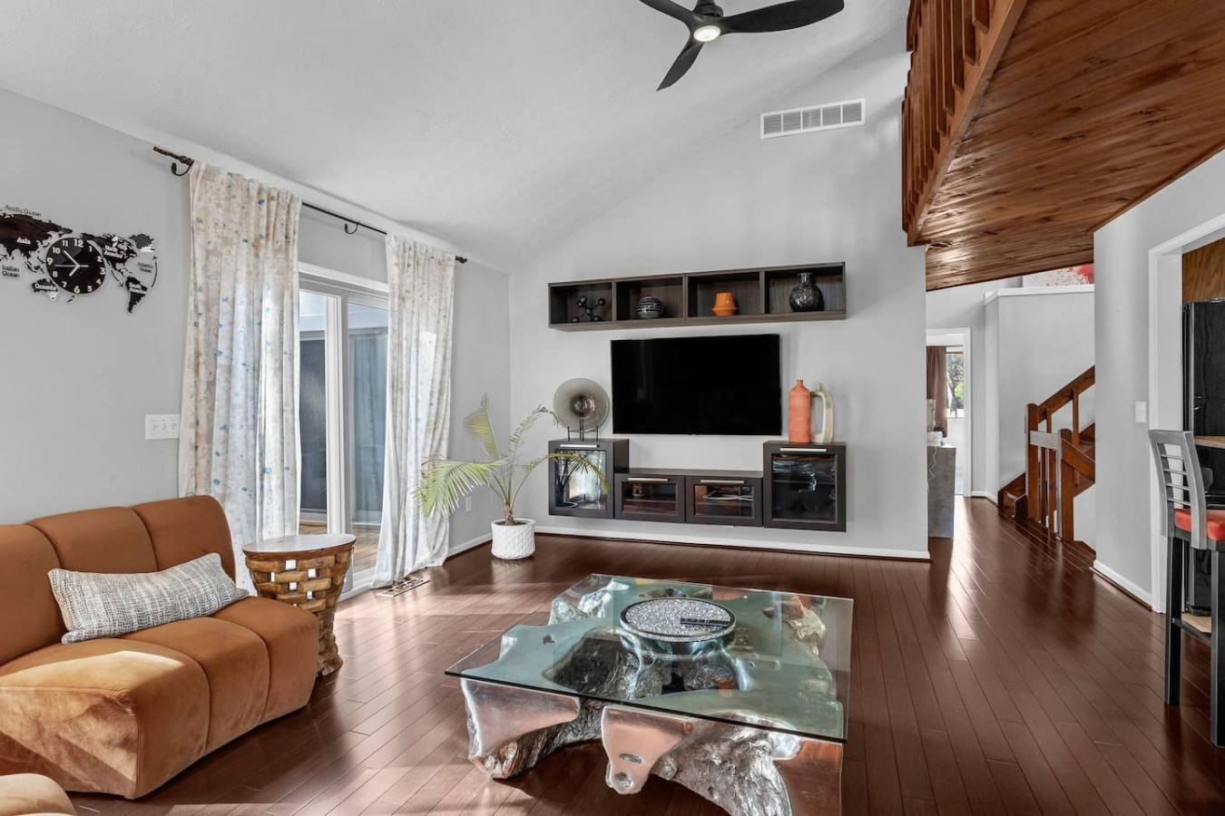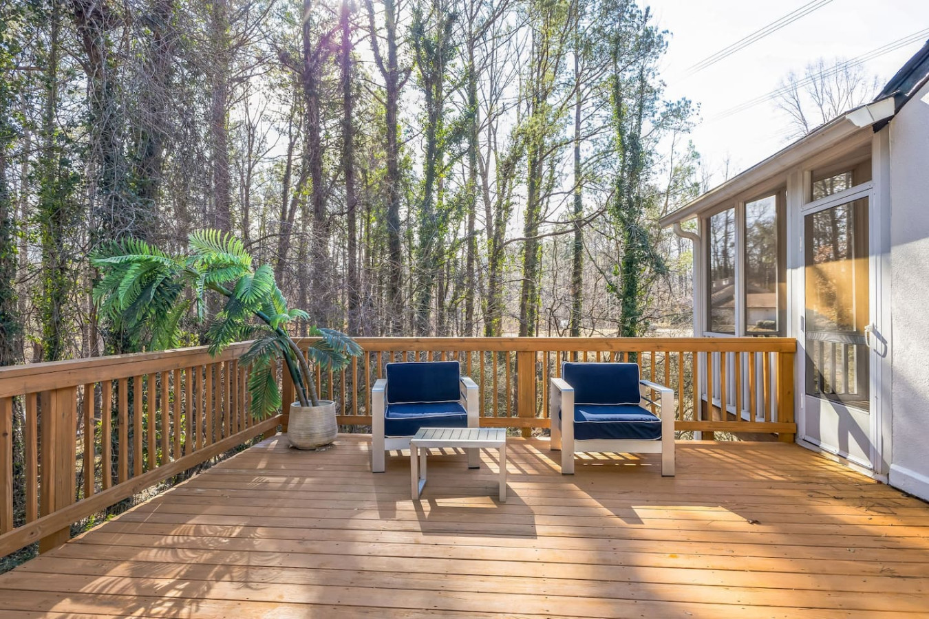 This spacious and comfortable mid-century modern home features 3 bedrooms and 3 bathrooms on the top floor, offering plenty of space for your family. The loft at the top of the staircase adds a touch of elegance and can be used as a cozy reading nook... or a convenient office space. The large deck is perfect for outdoor entertaining or simply enjoying the serene surroundings, while the screened-in porch lets you savor the outdoors without worrying about pesky mosquitoes.