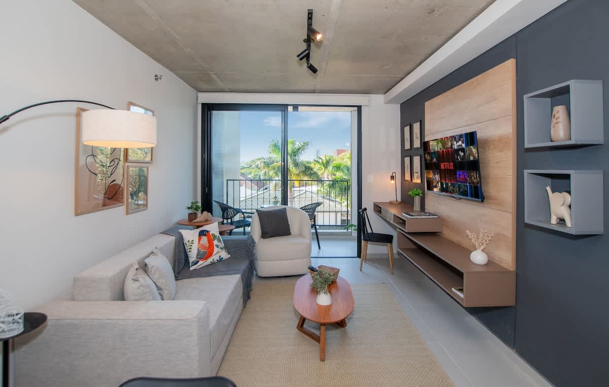 69m w/ private balcony * 3 mins walking distance to cafes, dining and shopping center * Fully equipped for a comfortable stay * 1 ensuite bedroom + 1 double bedroom + sofa bed * Dedicated workspace * 1 smart TVs * Onsite washer * 24/7 doorman * Par...king for 1 car * 200 Mbps Wi-Fi Amenities (on the terrace) * Pool * 2 BBQ / Event Room (1 outdoor and 1 air conditioned) * Gym * Movie Theater * Workspace / Coworking Add my listing to your wishlist by clicking the in the upper-right corner. space neighborhood transit